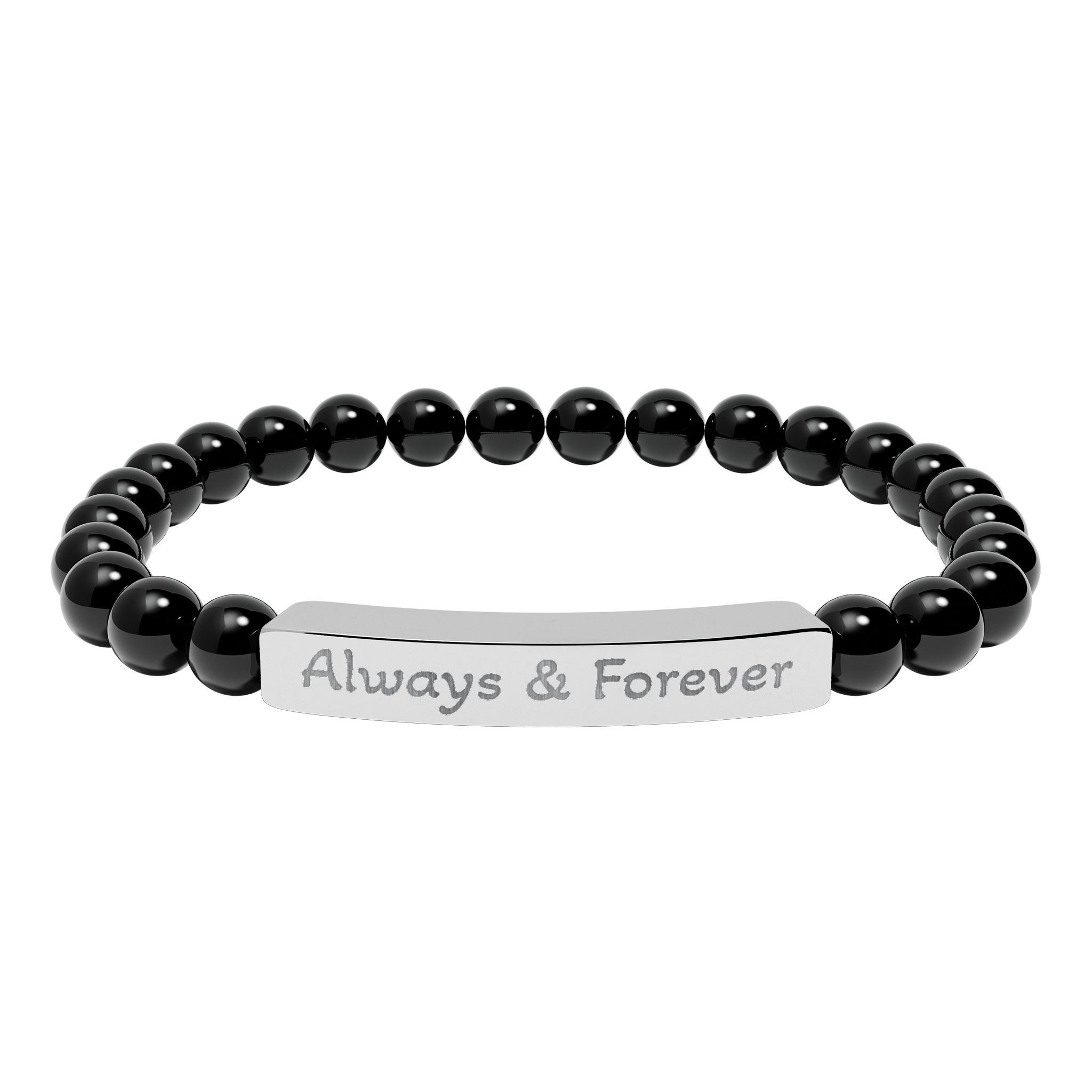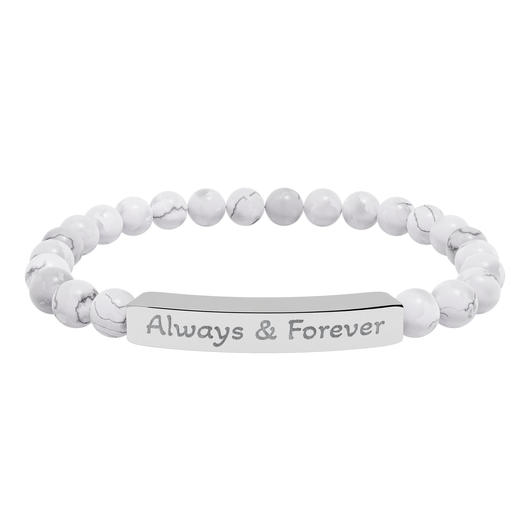 Soft, natural stone beads meet a sleek engraved stainless steel bar to create a bracelet that feels both personal and timeless. The stretch design slips on easily, settling comfortably against the wrist while the engraved message offers a subtle, lasting statement. Beads range from cool white marbled tones to warm, muted pastels—each bead’s natural variations make every piece slightly different. Finished in durable 316L surgical stainless steel with optional 18K PVD gold, the bar’s permanent engraving stays crisp without fading. Packaged in a white gloss jewelry box with non-tarnish cotton for safe keeping, this bracelet carries a quiet elegance for everyday wear or meaningful moments.