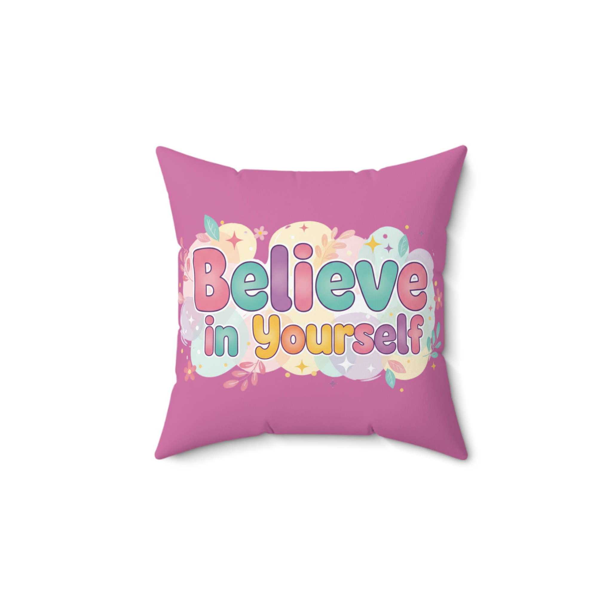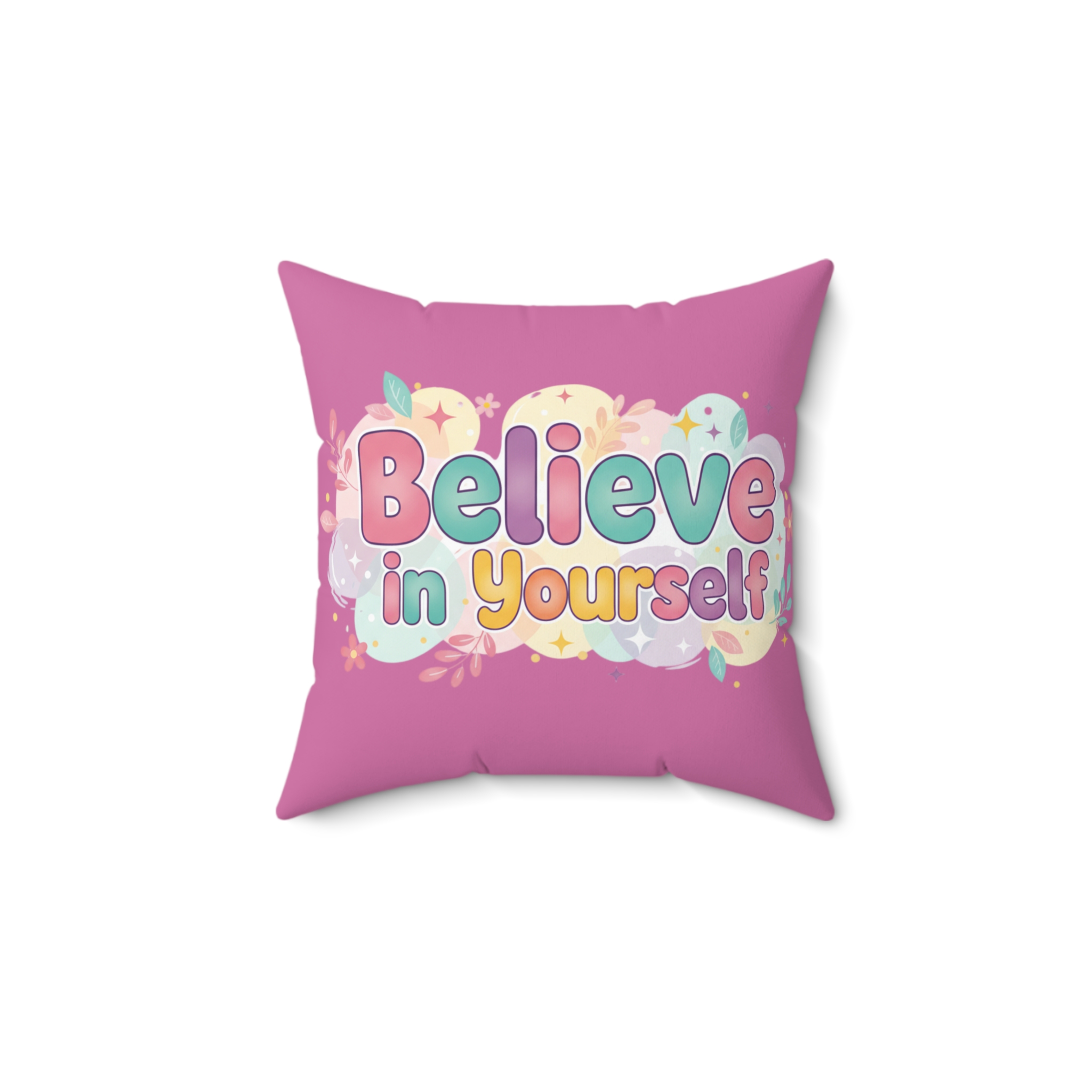Soft, cheerful, and unapologetically encouraging — this square pillow brings a pop of pastel optimism to bedrooms, playrooms, or cozy nooks. The bright, bubble-letter message “Believe in Yourself” sits inside a cloud of stars, leaves, and candy-colored accents on a warm pink background. It feels like a small daily pep talk: tuck it into a reading corner, add it to a kid’s bedspread, or use it to brighten a craft room. The spun-poly cover holds crisp color and shape, the recycled polyester insert gives a pleasantly plump finish, and the concealed zipper keeps the focus on the sweet design. It’s a little burst of confidence you can lean on. Product features – Durable spun polyester cover resists wrinkles and keeps shape – Double-sided print with vibrant, fade-resistant colors – Recycled polyester insert arrives slightly oversized for extra loft – Concealed beige zipper with metal head blends into the design – Cover ships separately (insert vacuum-packed) to reduce creasing Care instructions – Remove the pillow cover. Pre-treat the stains with soft cloth or bristle brush that had been soaked in warm soapy water. Machine wash, max 40°C (104°F), normal cycle. Do not bleach, tumble dry on low, do not dry-clean. Iron, steam, or dry low heat only. Fluff to reshape when assembling it back together.