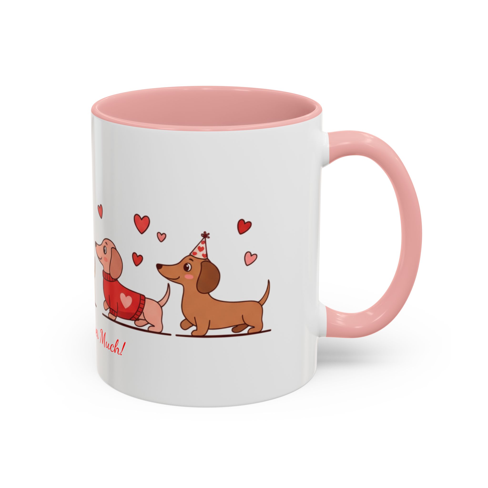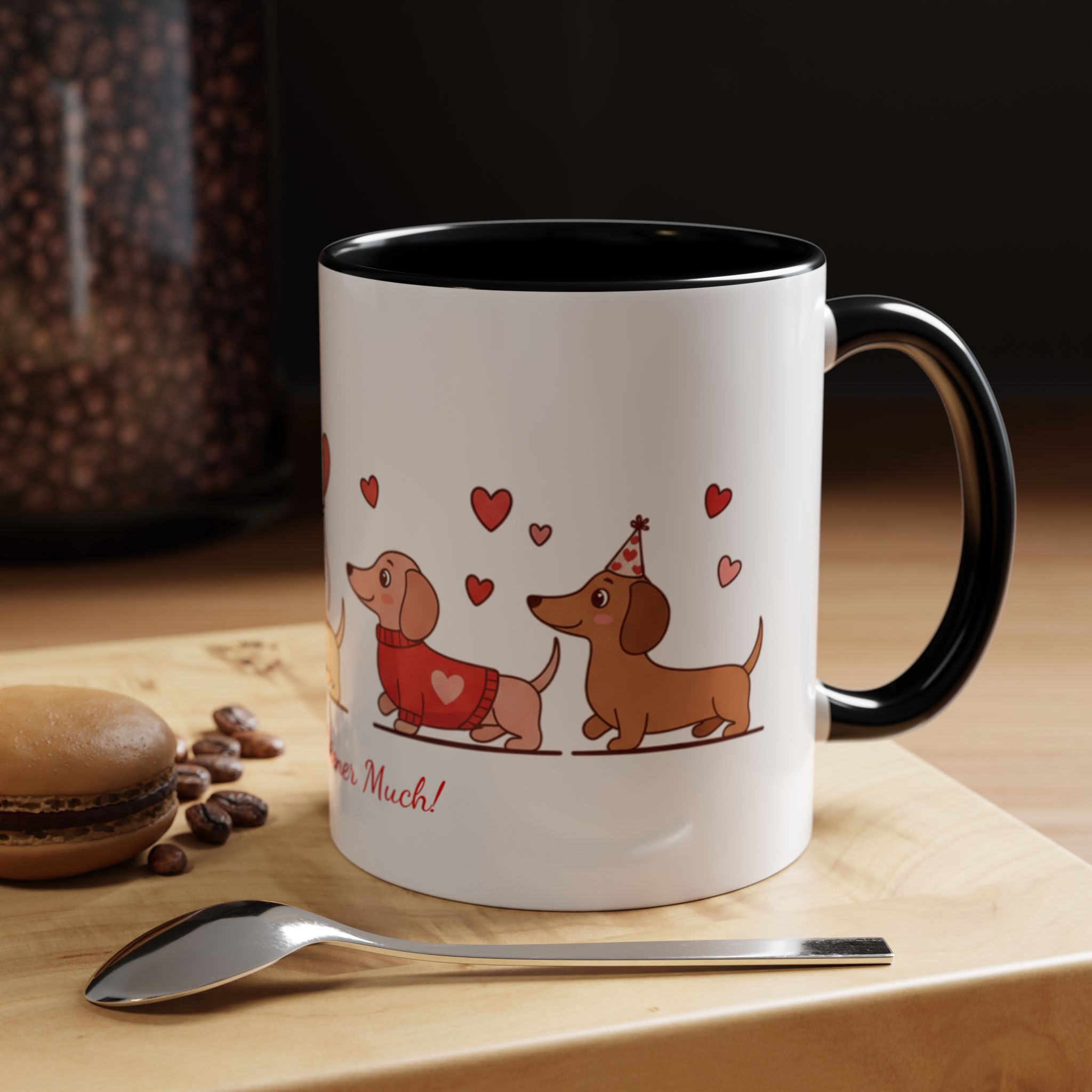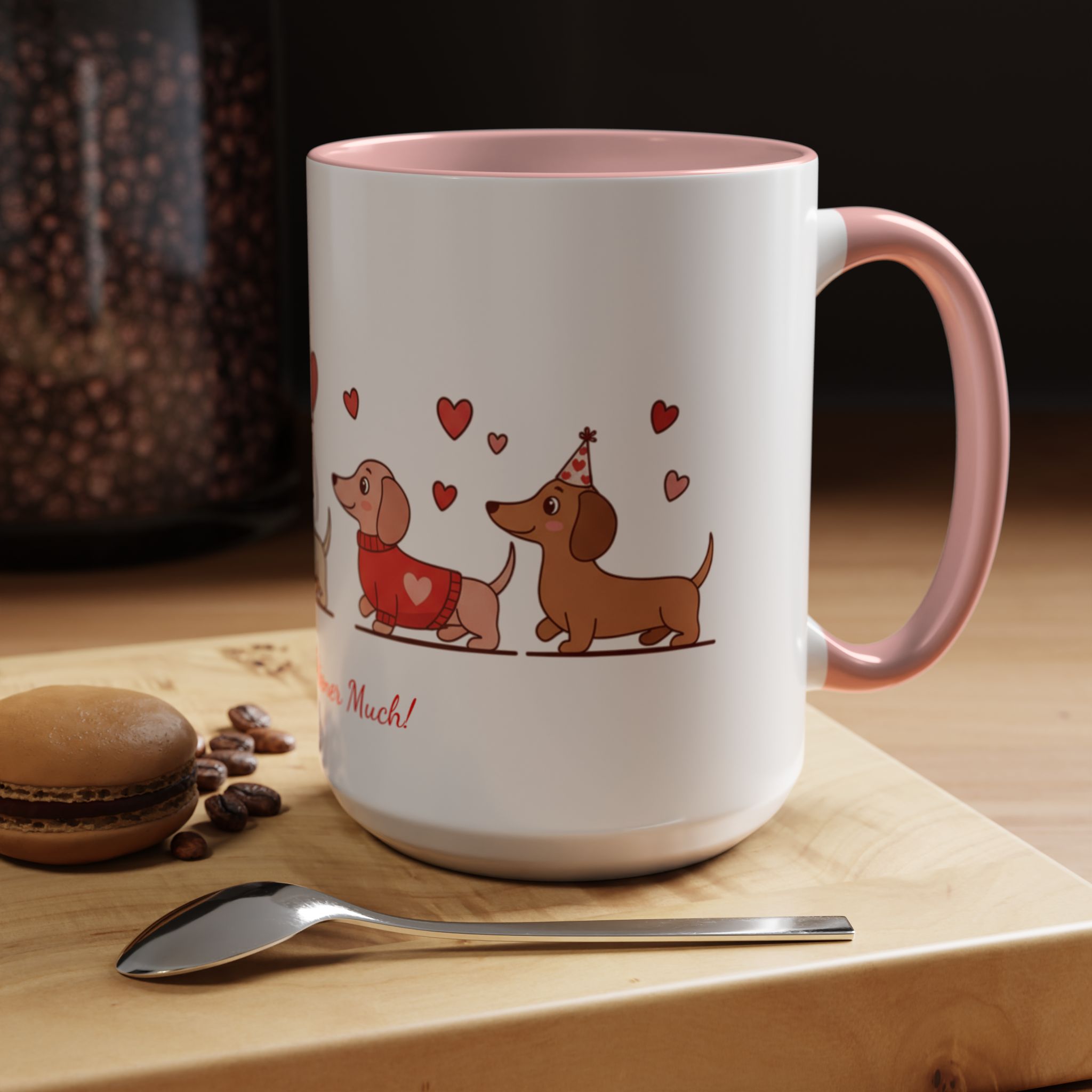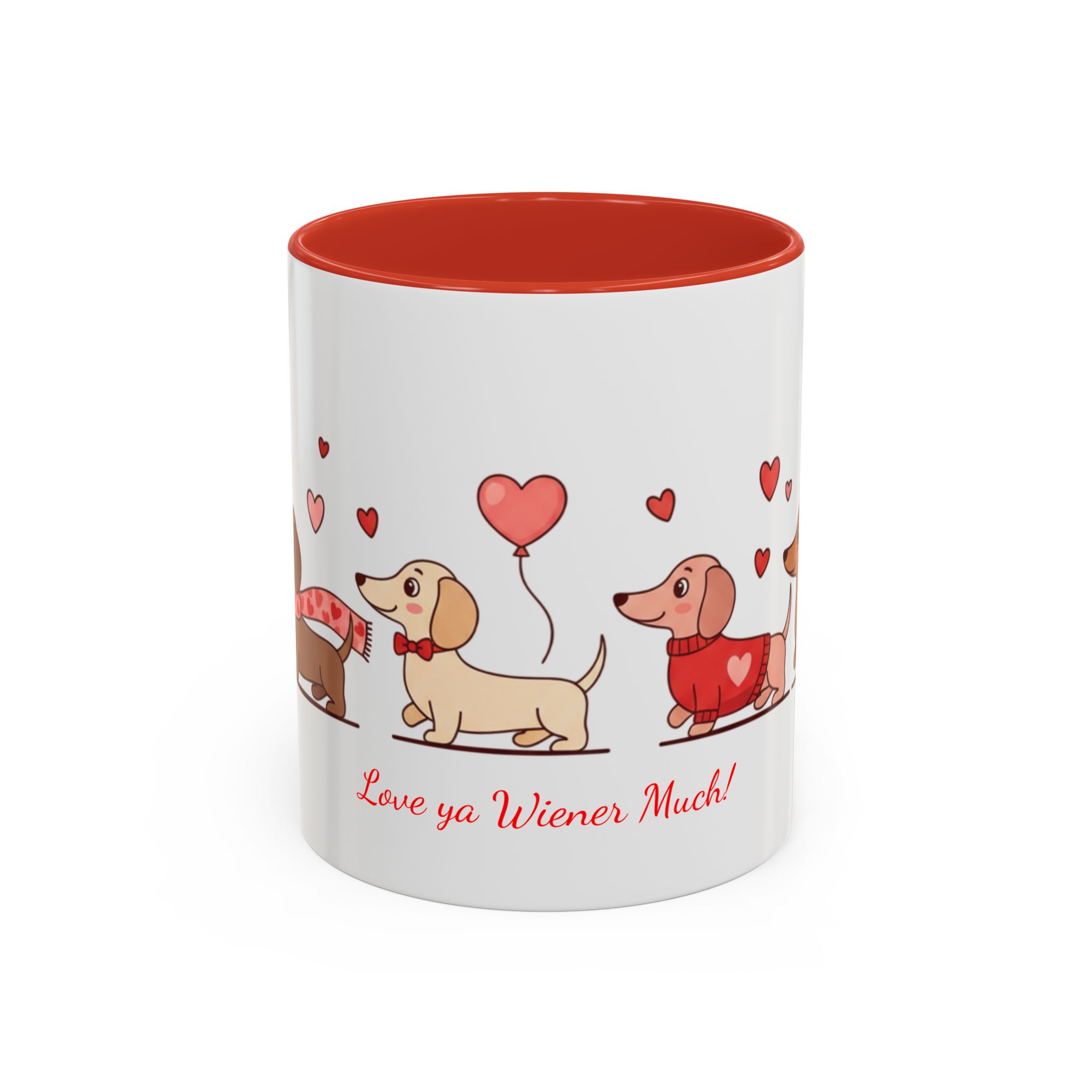 Warm, playful, and impossible to ignore — this ceramic mug brings a little dachshund-sized love to every morning. A row of cheerful wiener dogs parade around the mug, each dressed in tiny hearts and holding balloon shapes, while the sweet script below reads “Love ya Wiener Much!” Bright interior and handle colors add a pop that frames the illustrations and lifts the whole design. It feels like a note from a friend: lighthearted, affectionate, and a bit silly. Keep it on your desk during cozy mornings, pass it along at a Valentine’s brunch, or sip from it after a long walk with your pup. The glossy finish and crisp print keep the art vibrant through daily use, while microwave- and dishwasher-safe construction makes it easy to live with. This mug makes everyday coffee, tea, or cocoa feel like a small celebration with a furry companion at your side.