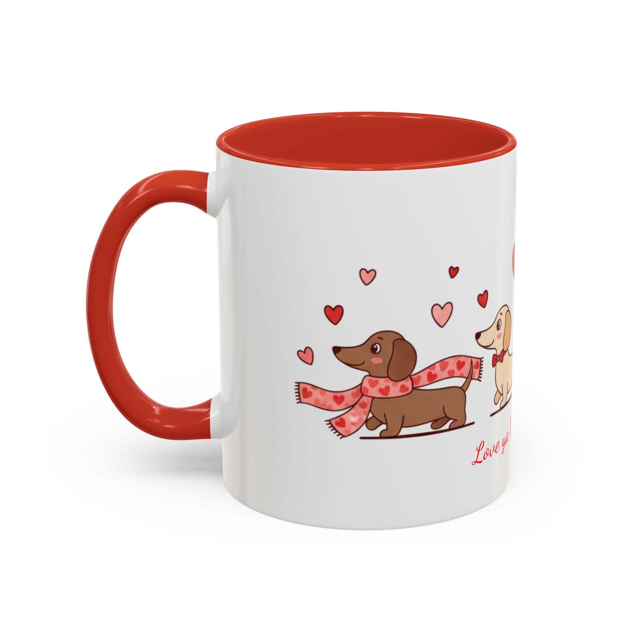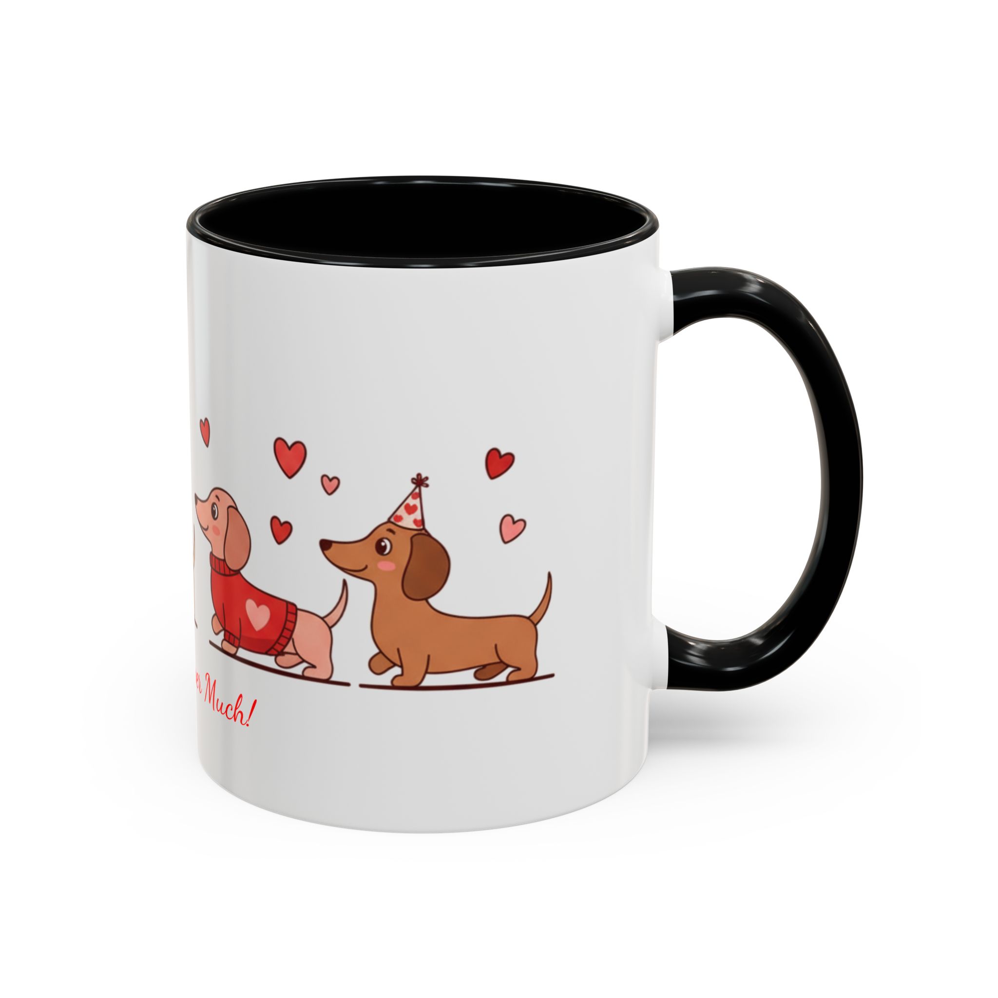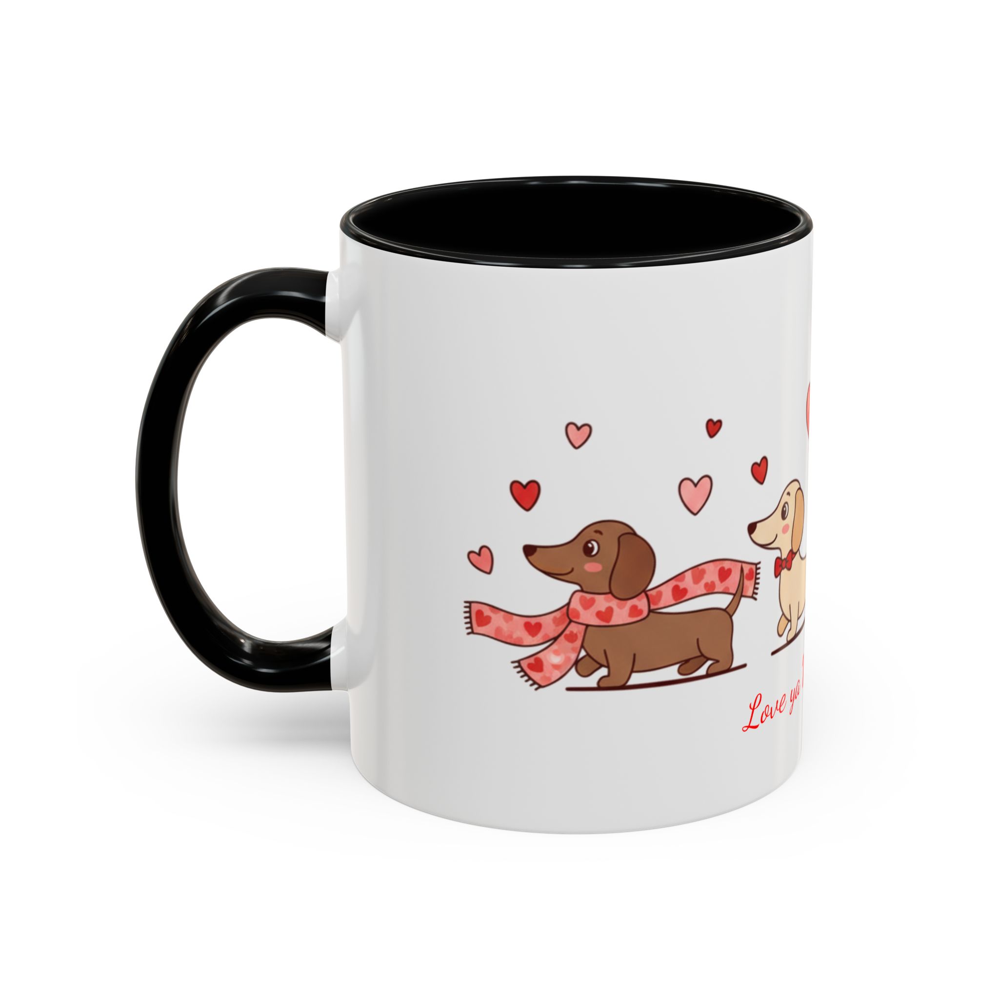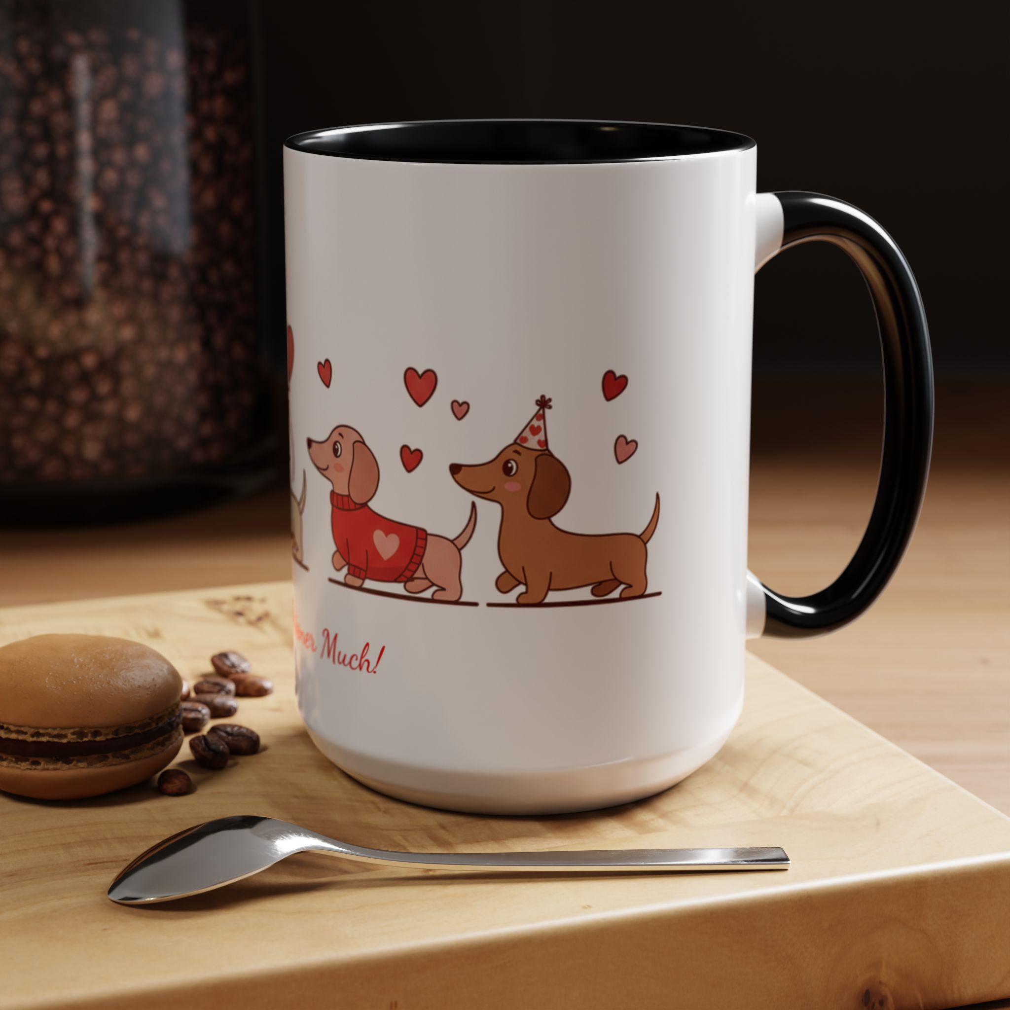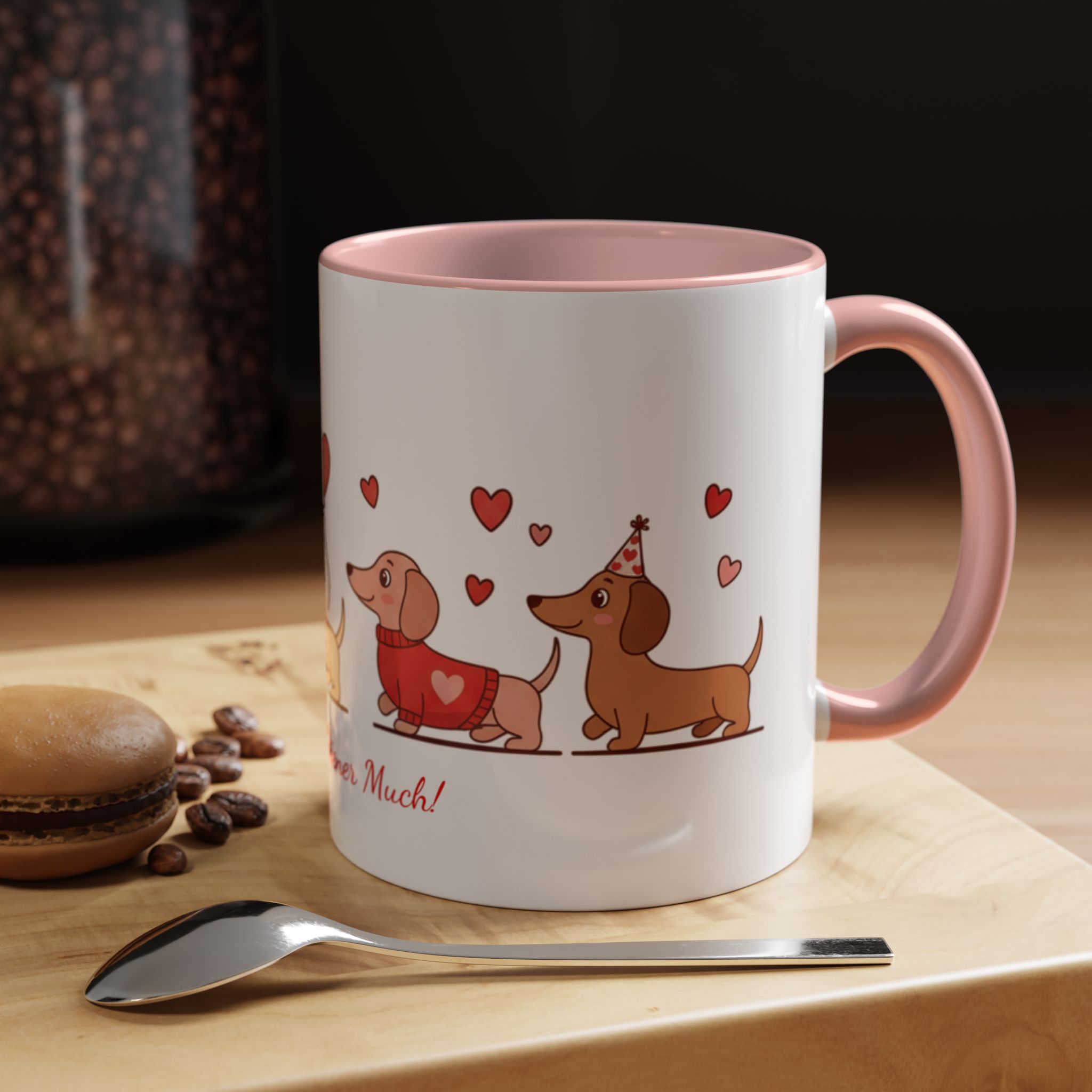 Warm, playful, and impossible to ignore — this ceramic mug brings a little dachshund-sized love to every morning. A row of cheerful wiener dogs parade around the mug, each dressed in tiny hearts and holding balloon shapes, while the sweet script below reads “Love ya Wiener Much!” Bright interior and handle colors add a pop that frames the illustrations and lifts the whole design. It feels like a note from a friend: lighthearted, affectionate, and a bit silly. Keep it on your desk during cozy mornings, pass it along at a Valentine’s brunch, or sip from it after a long walk with your pup. The glossy finish and crisp print keep the art vibrant through daily use, while microwave- and dishwasher-safe construction makes it easy to live with. This mug makes everyday coffee, tea, or cocoa feel like a small celebration with a furry companion at your side.