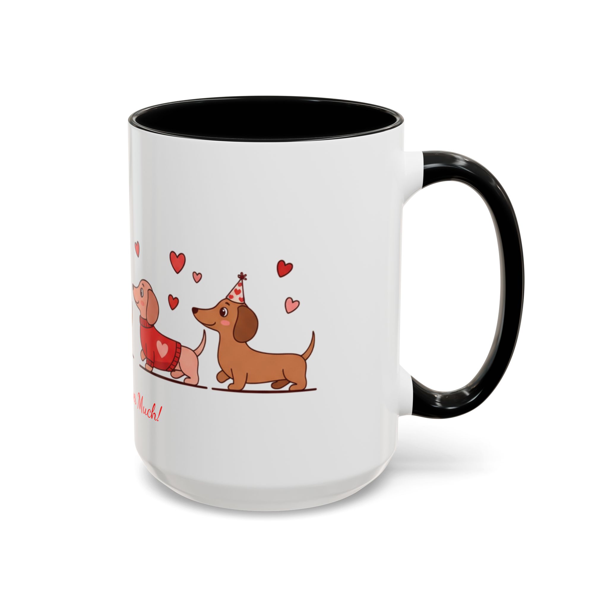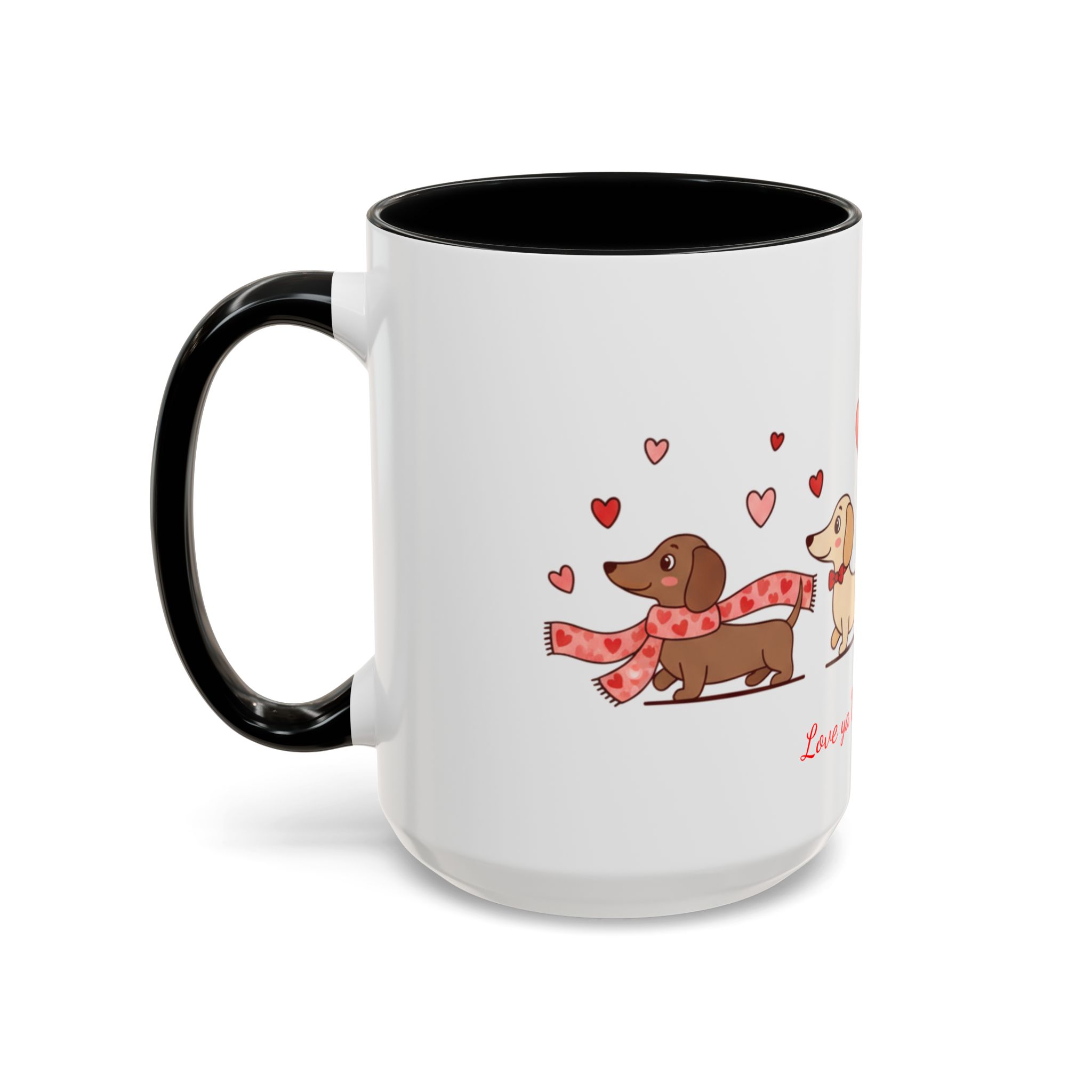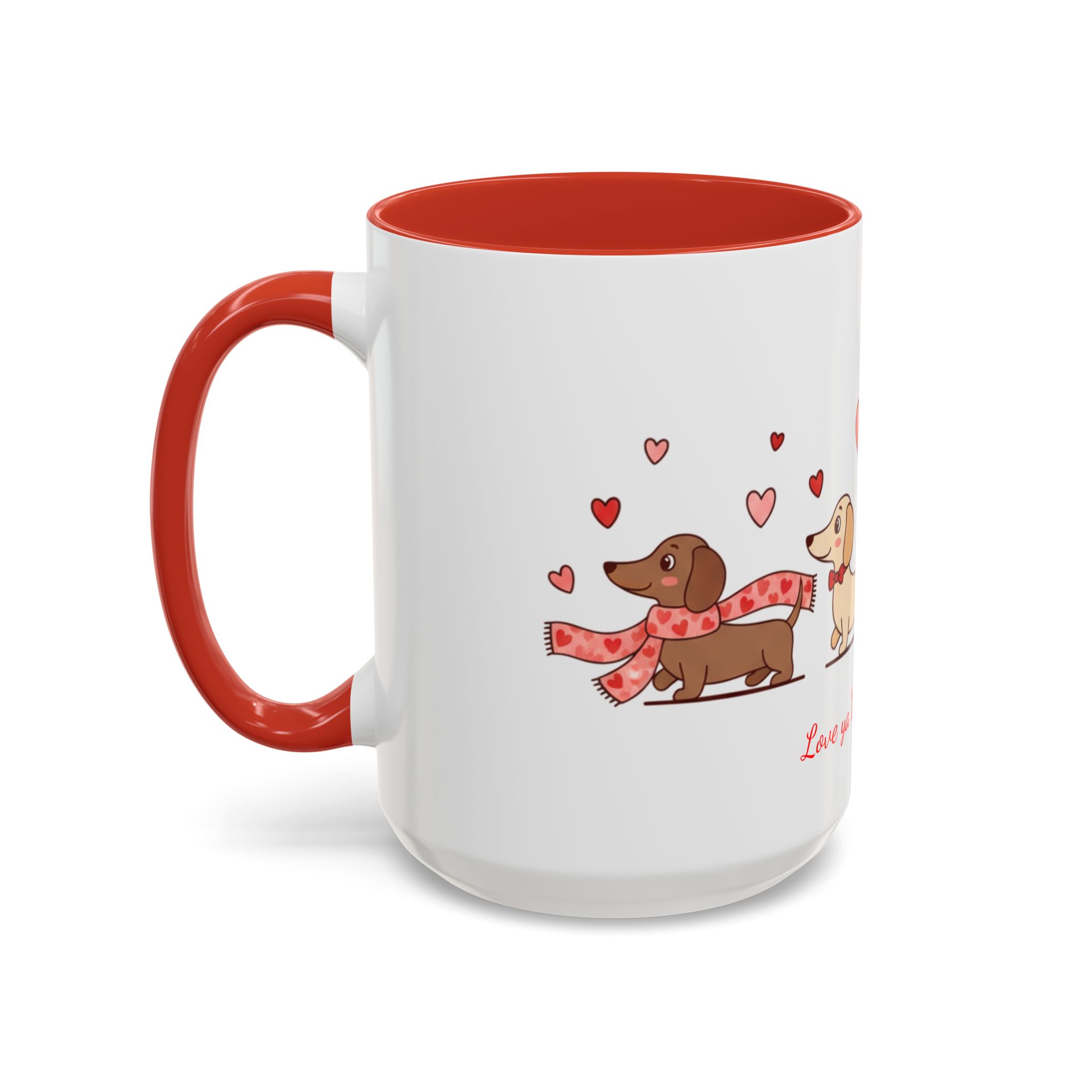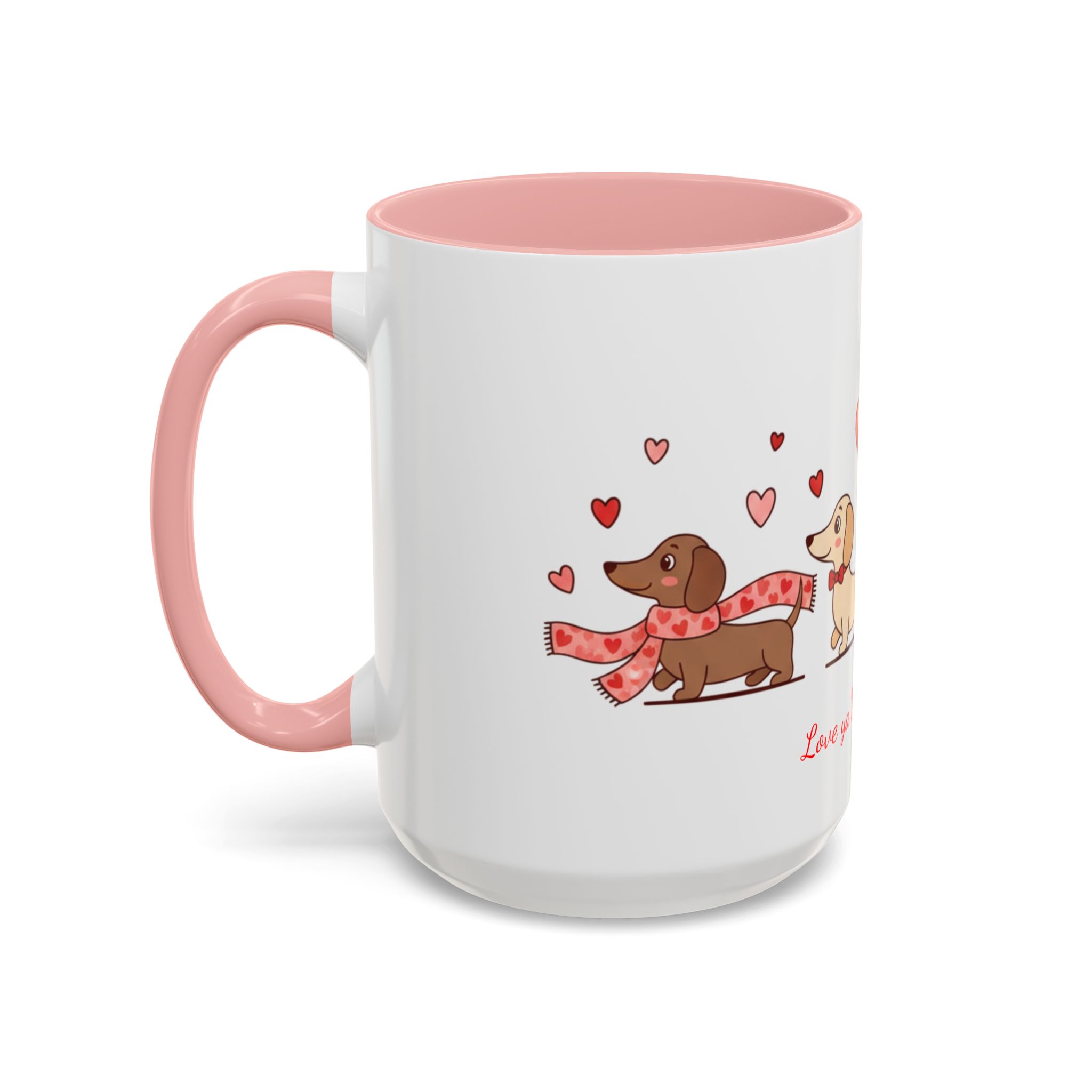 Warm, playful, and impossible to ignore — this ceramic mug brings a little dachshund-sized love to every morning. A row of cheerful wiener dogs parade around the mug, each dressed in tiny hearts and holding balloon shapes, while the sweet script below reads “Love ya Wiener Much!” Bright interior and handle colors add a pop that frames the illustrations and lifts the whole design. It feels like a note from a friend: lighthearted, affectionate, and a bit silly. Keep it on your desk during cozy mornings, pass it along at a Valentine’s brunch, or sip from it after a long walk with your pup. The glossy finish and crisp print keep the art vibrant through daily use, while microwave- and dishwasher-safe construction makes it easy to live with. This mug makes everyday coffee, tea, or cocoa feel like a small celebration with a furry companion at your side.