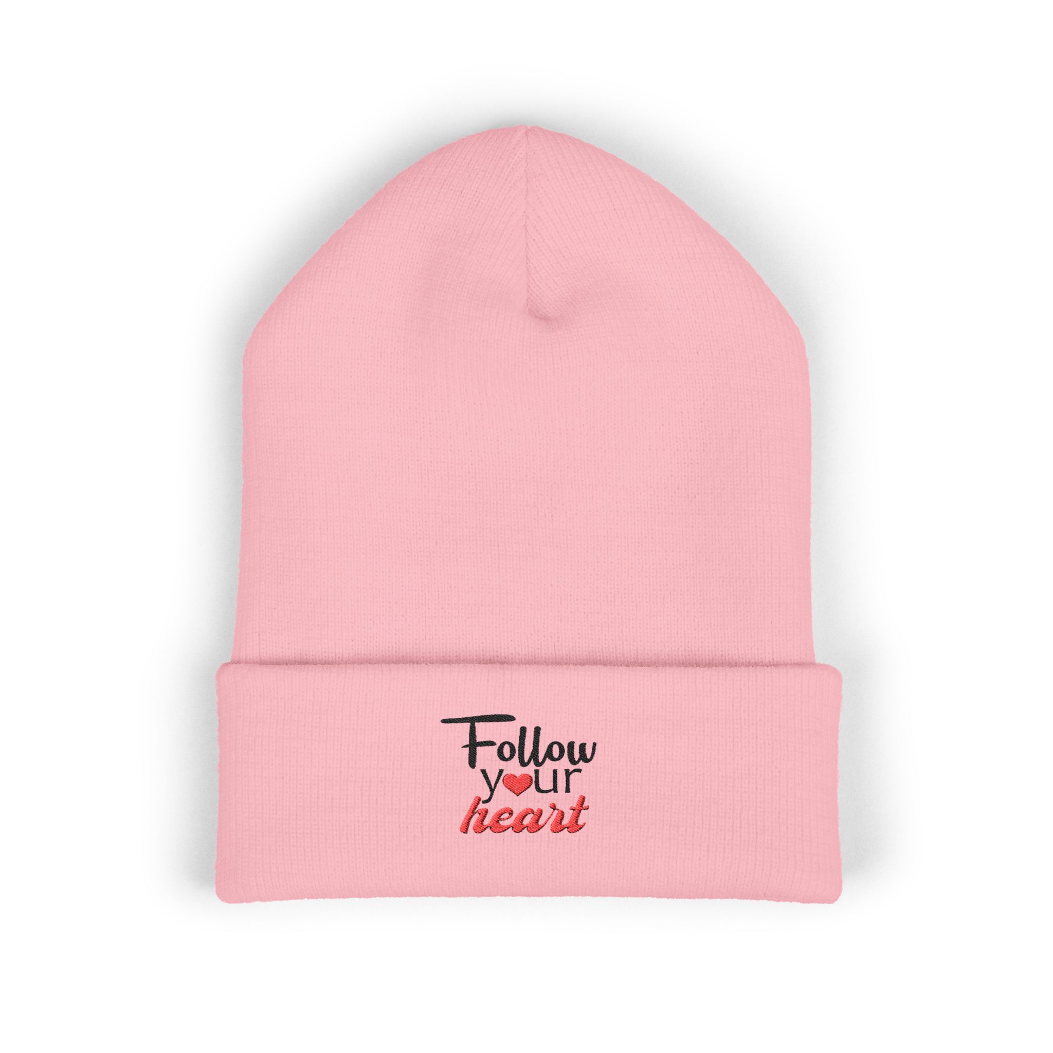 Soft, simple, and quietly bold — this cuffed beanie carries a tiny embroidered reminder on the fold: “Follow your heart.” Lightweight yet warm, the knit sits close to the head and stretches to fit, so it moves with you from chilly morning walks to late-night coffee runs. The embroidered script adds a handmade touch that reads intimate, not loud. It’s the kind of hat you reach for when you want comfort and a gentle nudge to stay true to yourself.