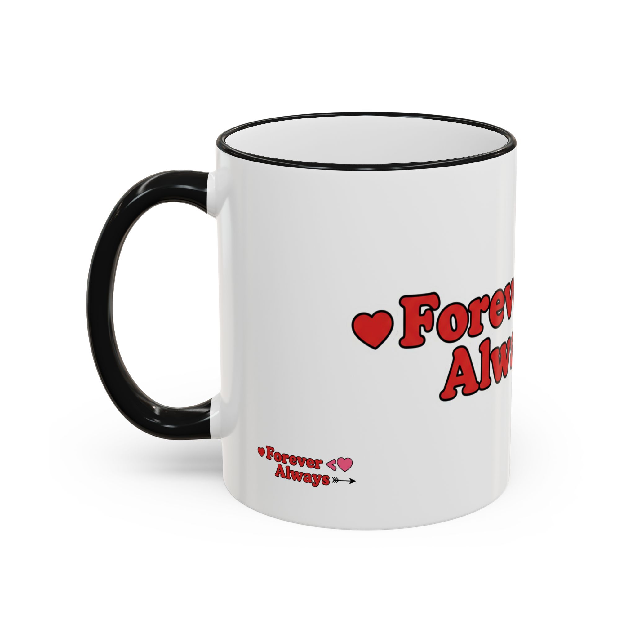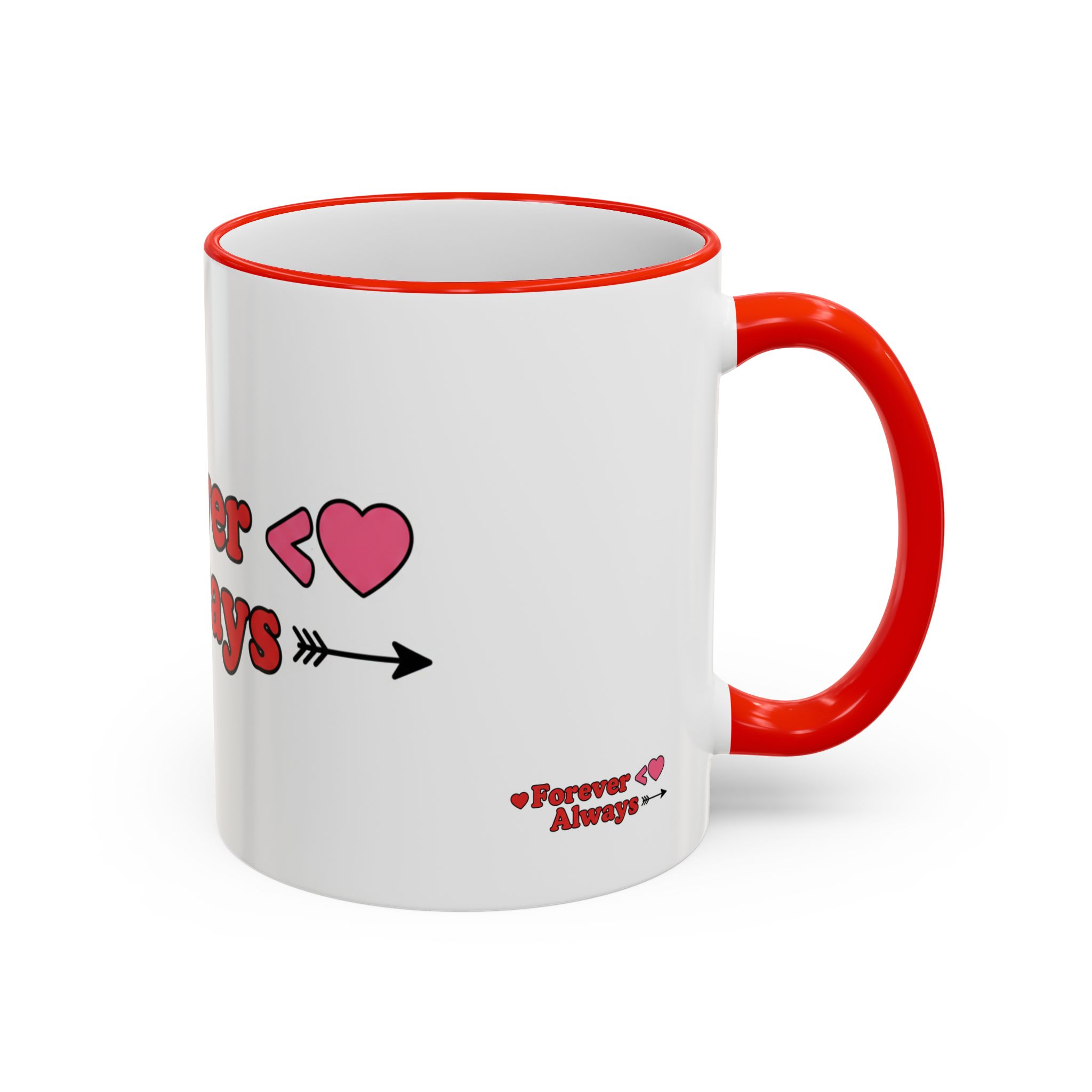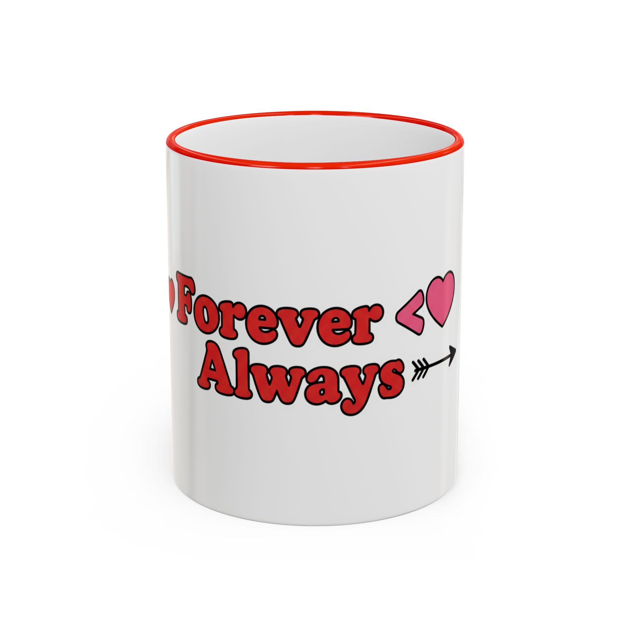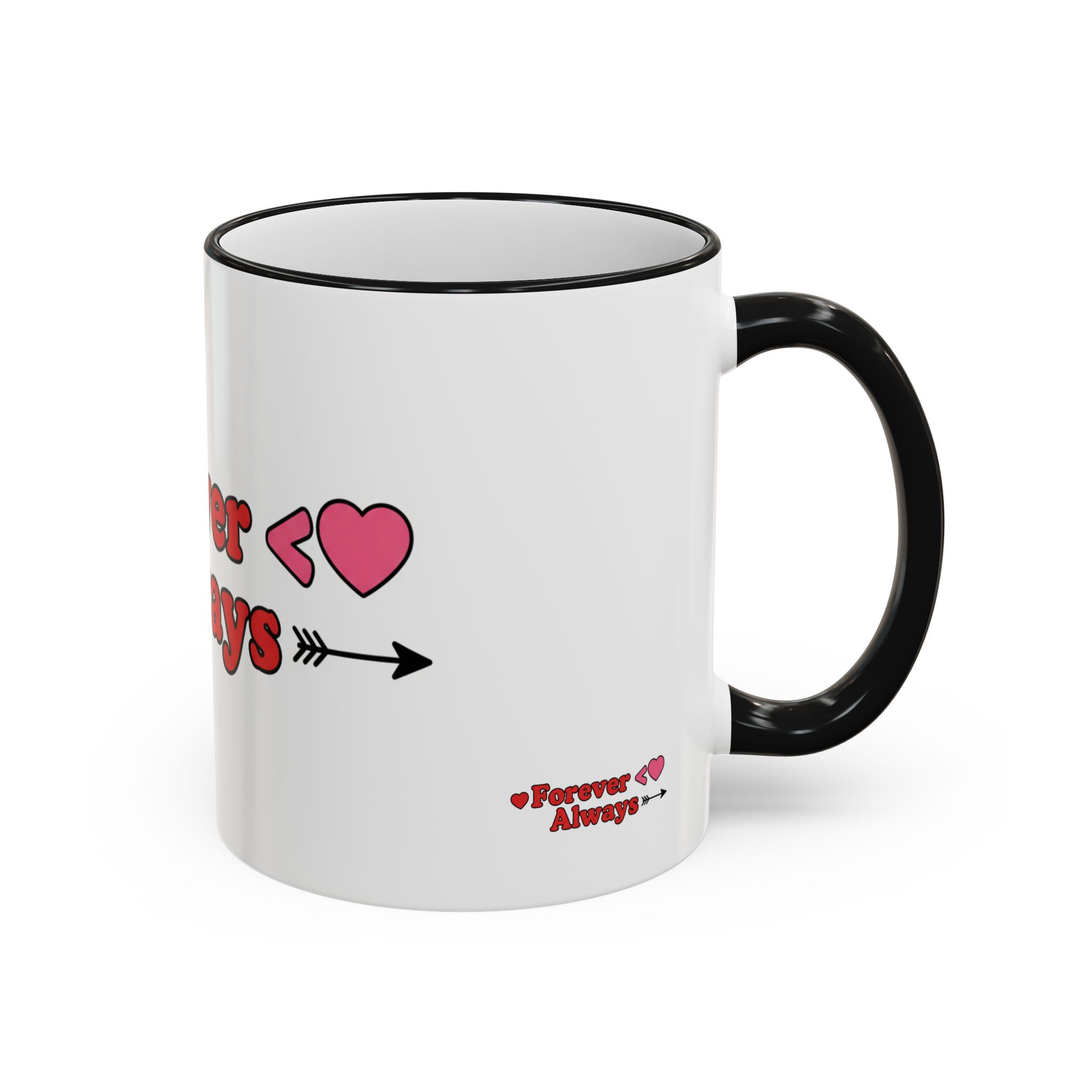 A white ceramic accent-rim mug with a bold, playful design that reads with heart motifs and an arrow accent. The contrasting colored rim and handle give it a retro, cheerful feel while the glossy ceramic keeps colors bright and crisp. It sits comfortably in the hand with a C-shaped handle and comes in two sizes to suit longer mornings or quick coffee breaks. Dishwasher- and microwave-safe for everyday use, it brings a warm, personal touch to cozy routines and shared moments.