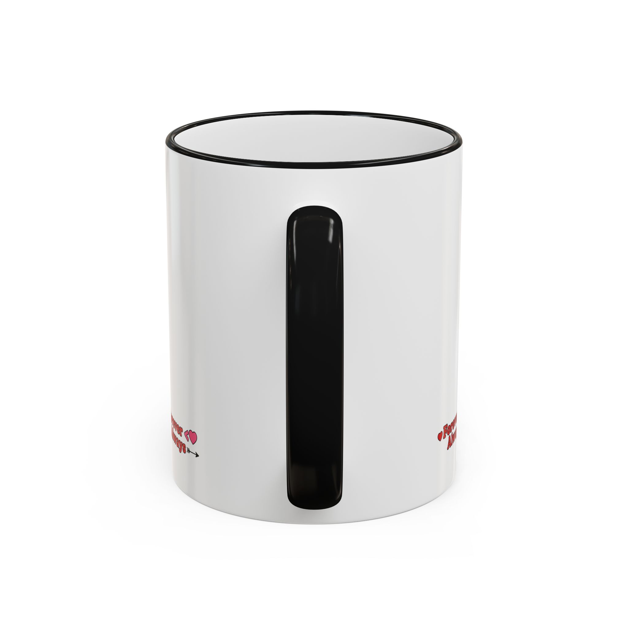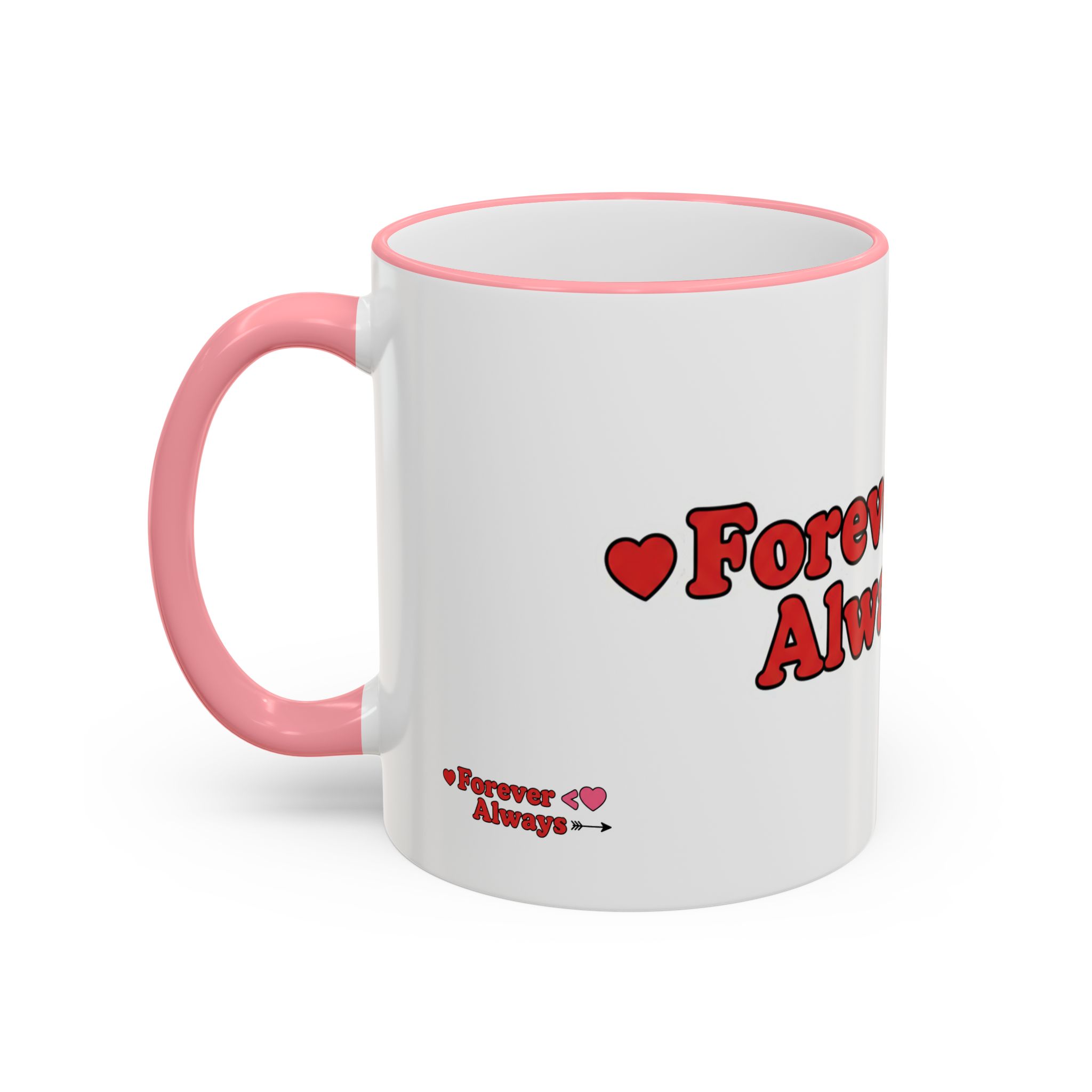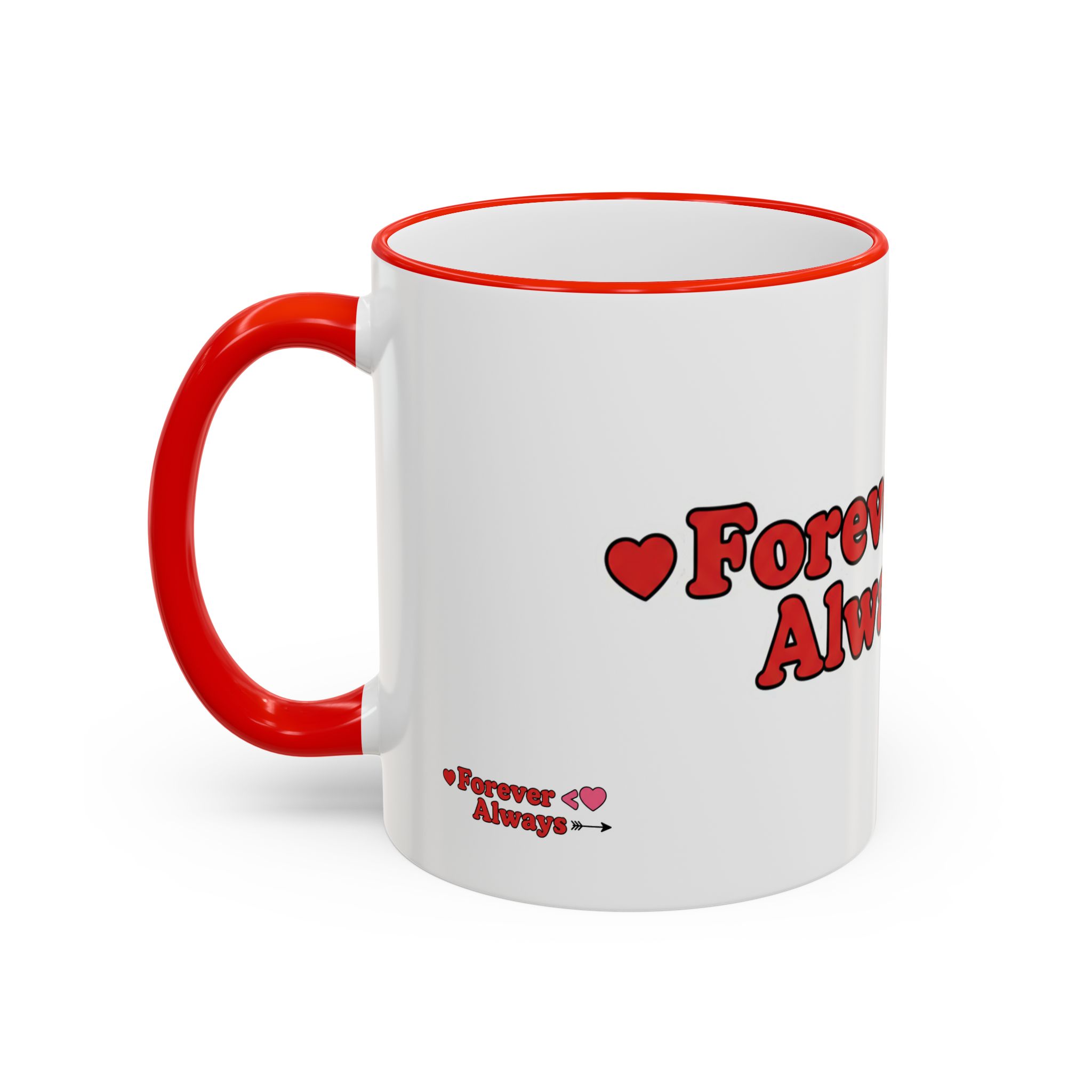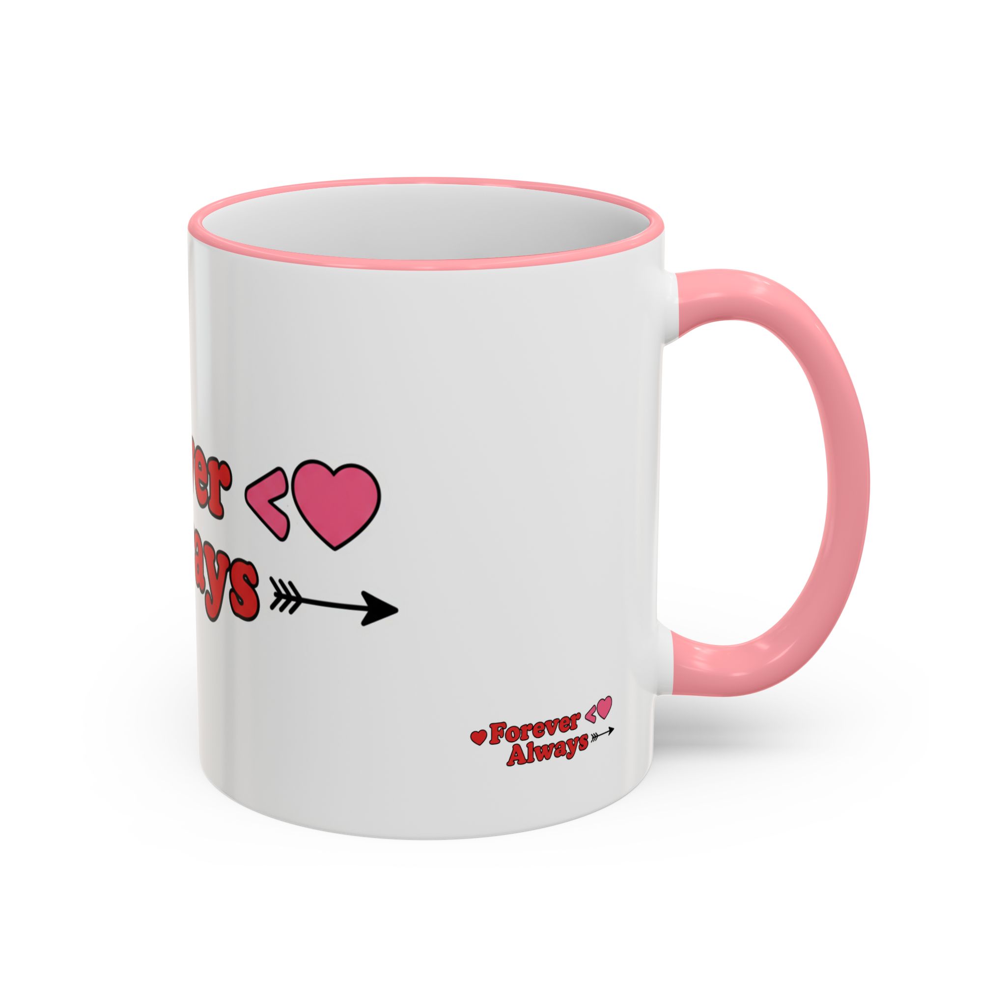 A white ceramic accent-rim mug with a bold, playful design that reads with heart motifs and an arrow accent. The contrasting colored rim and handle give it a retro, cheerful feel while the glossy ceramic keeps colors bright and crisp. It sits comfortably in the hand with a C-shaped handle and comes in two sizes to suit longer mornings or quick coffee breaks. Dishwasher- and microwave-safe for everyday use, it brings a warm, personal touch to cozy routines and shared moments.
