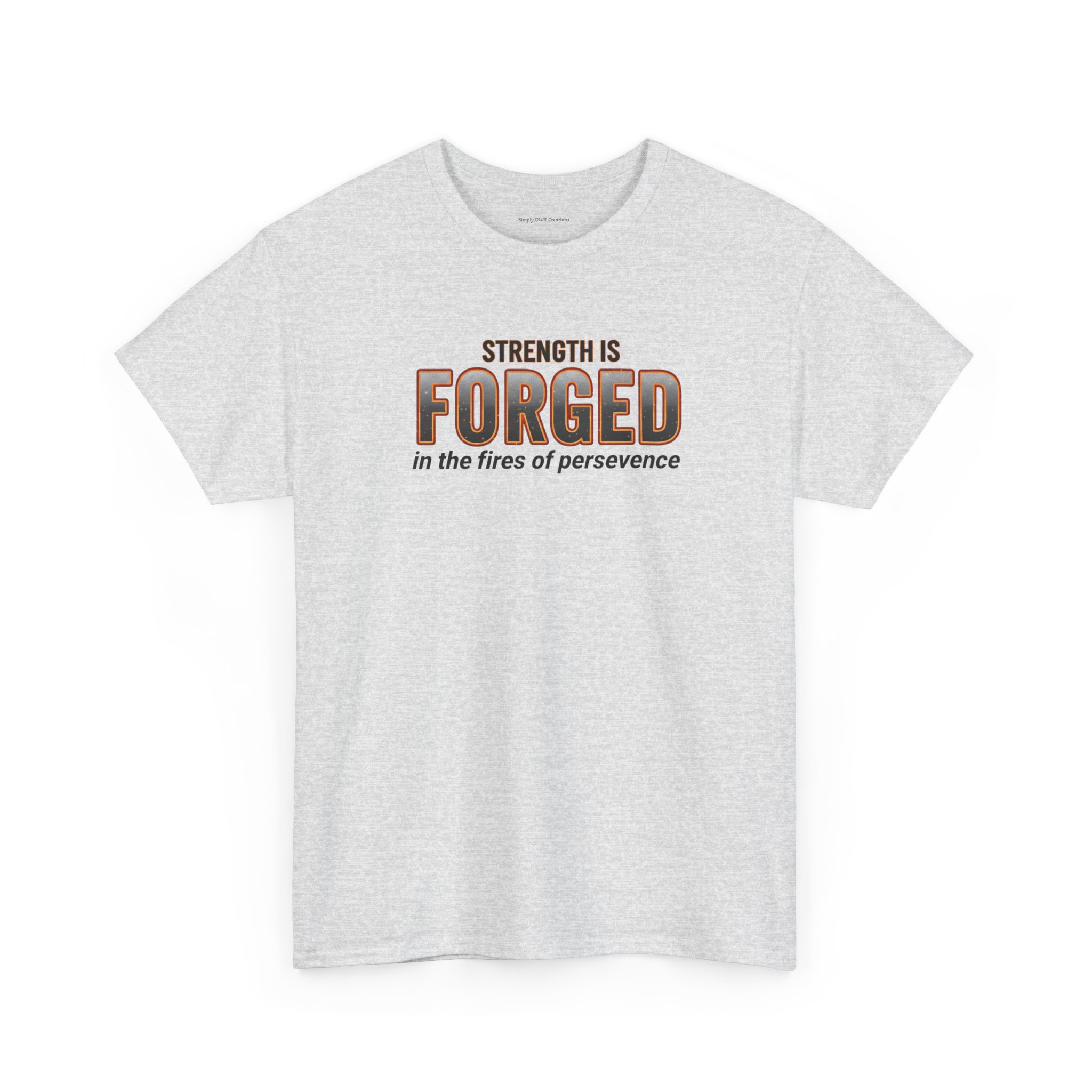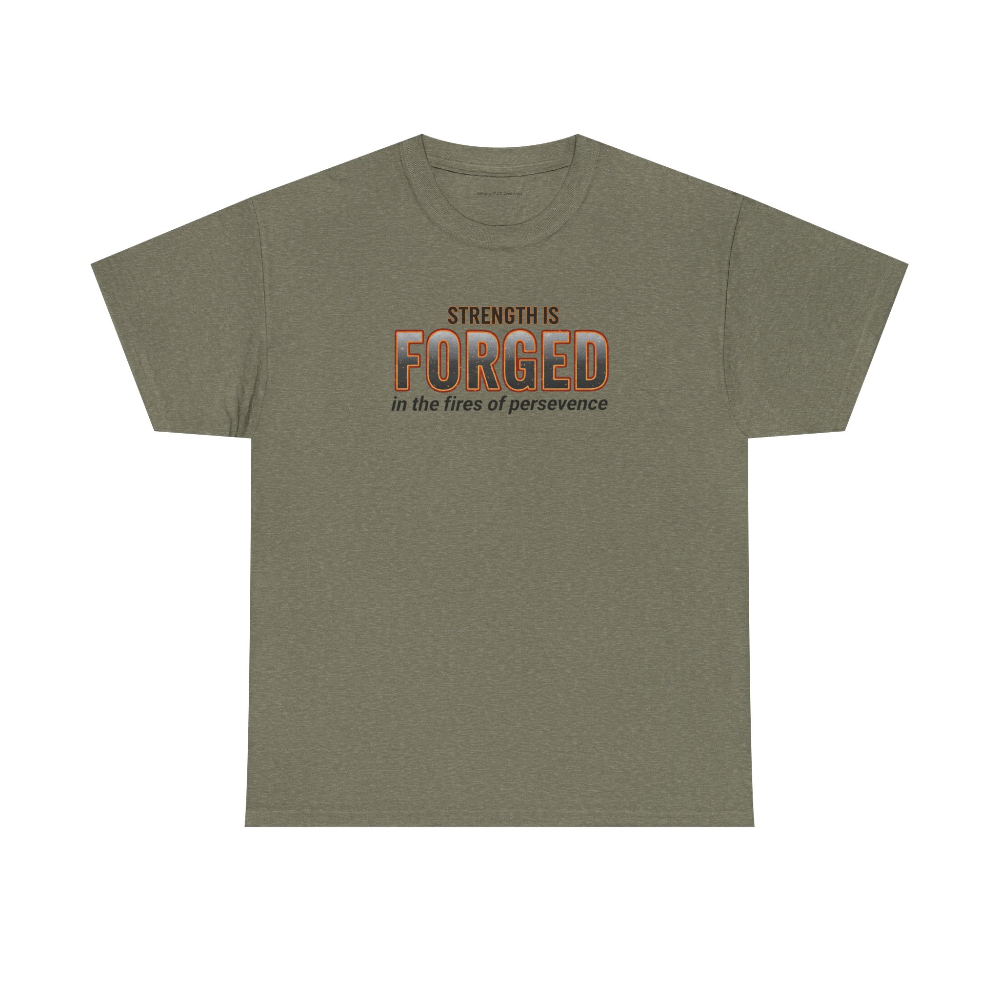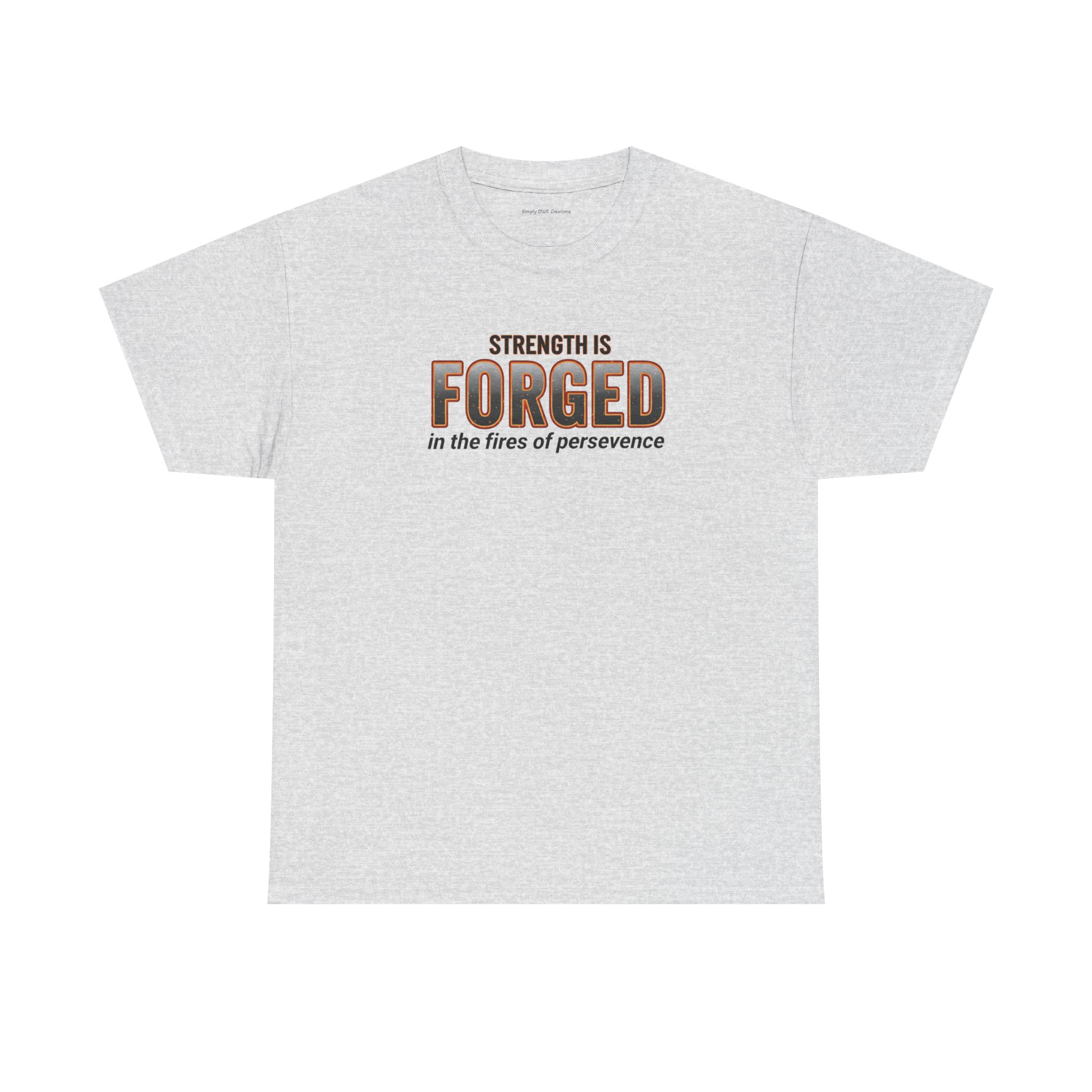 A clean, everyday tee with a quiet, determined message. The mid-weight cotton holds shape while the bold, metal-toned lettering — “Strength is Forged” — sits across the chest like a badge of earned resilience. Wear it after a long shift, between gym sets, or on the road home; it reads like a personal reminder rather than a slogan. The soft, tubular knit and ribbed collar make it comfortable for long days. Crisp prints on the sleeves and inner neck give it subtle, finished details that reward a closer look. This shirt slips easily into a layered outfit or stands alone as a simple statement of steady grit.