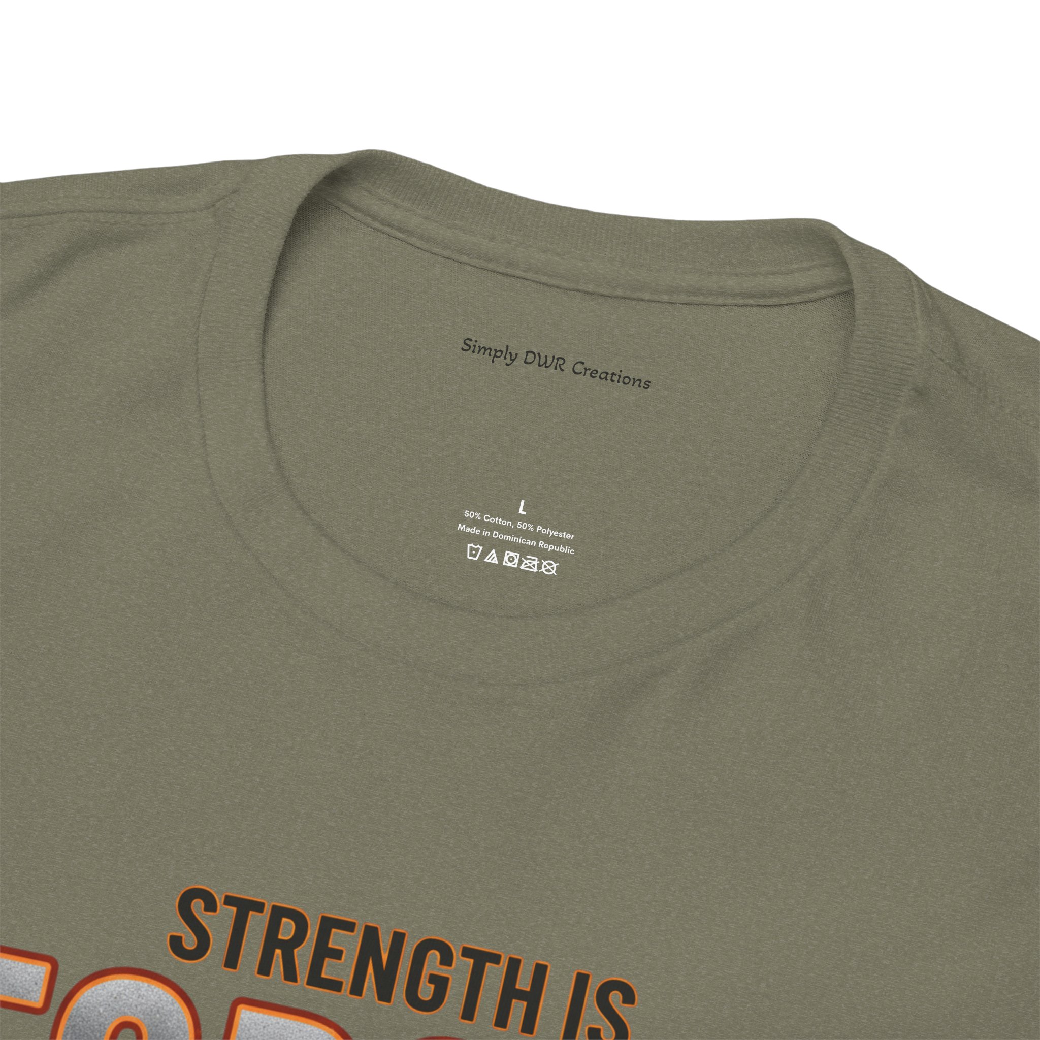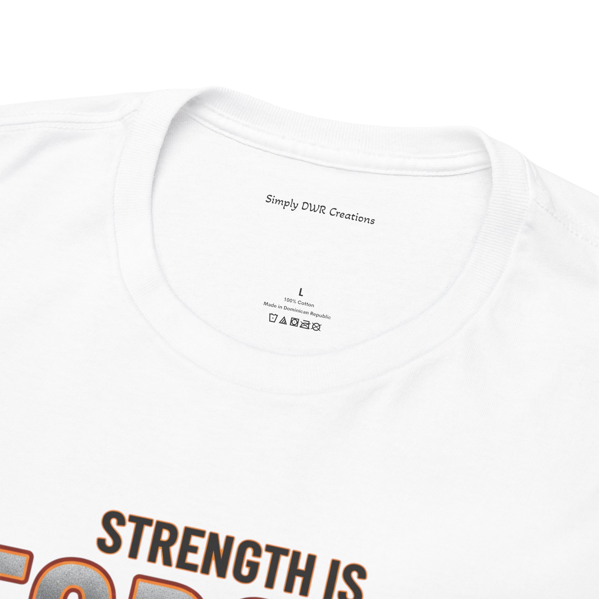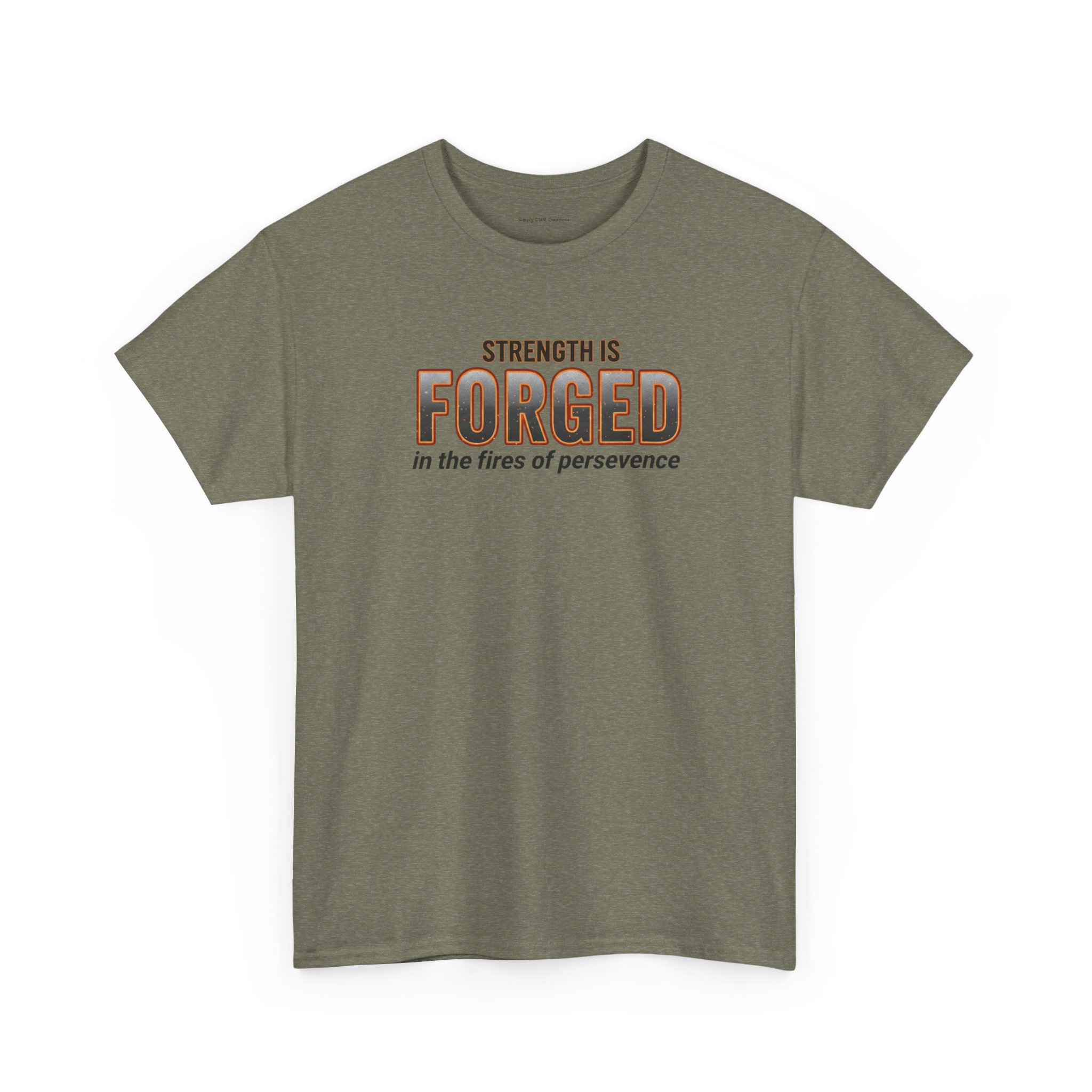 A clean, everyday tee with a quiet, determined message. The mid-weight cotton holds shape while the bold, metal-toned lettering — “Strength is Forged” — sits across the chest like a badge of earned resilience. Wear it after a long shift, between gym sets, or on the road home; it reads like a personal reminder rather than a slogan. The soft, tubular knit and ribbed collar make it comfortable for long days. Crisp prints on the sleeves and inner neck give it subtle, finished details that reward a closer look. This shirt slips easily into a layered outfit or stands alone as a simple statement of steady grit.