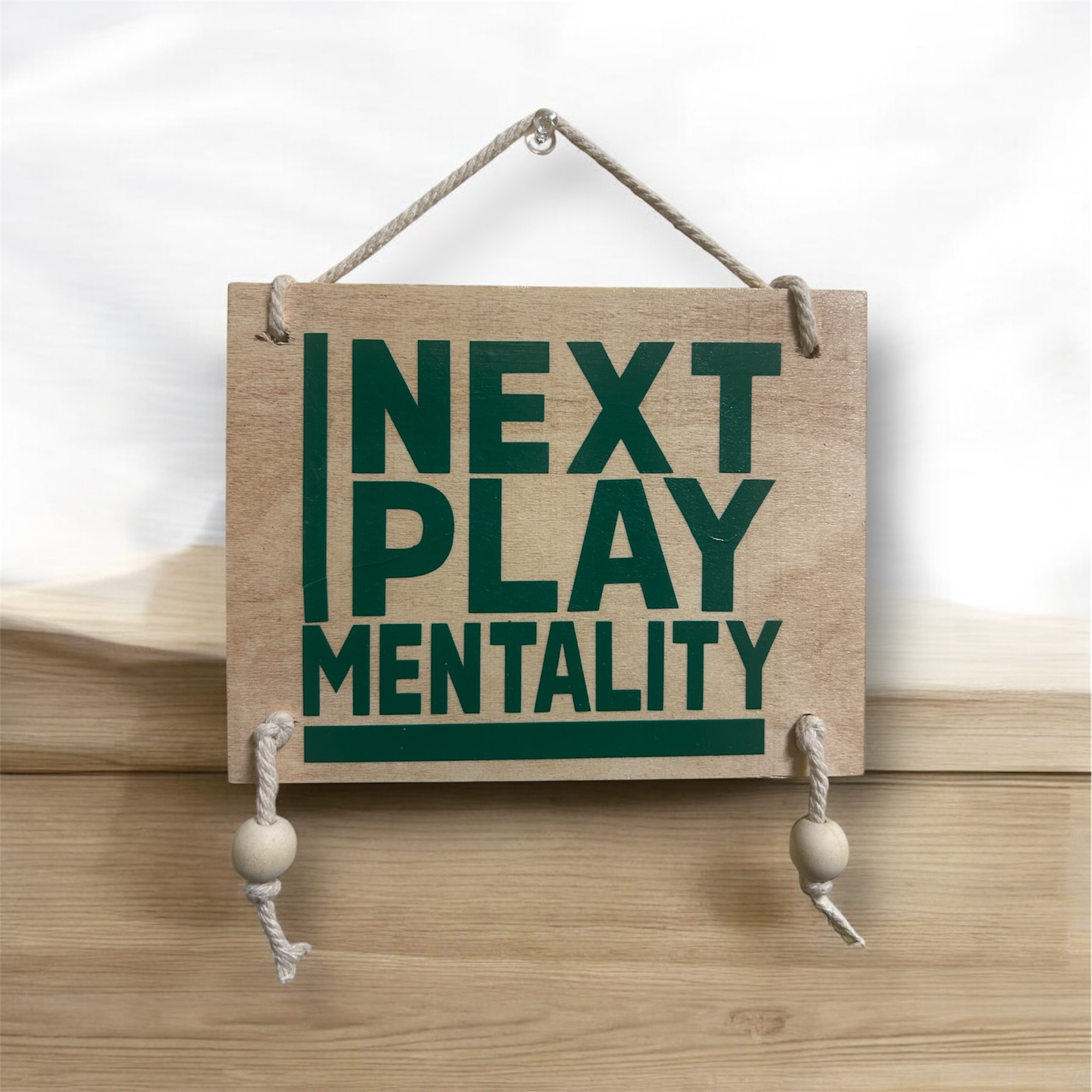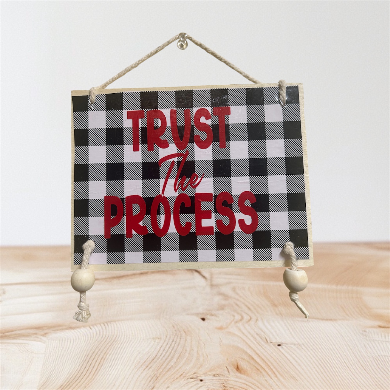 Hanging plaque with rope hanger & wooden bead accents