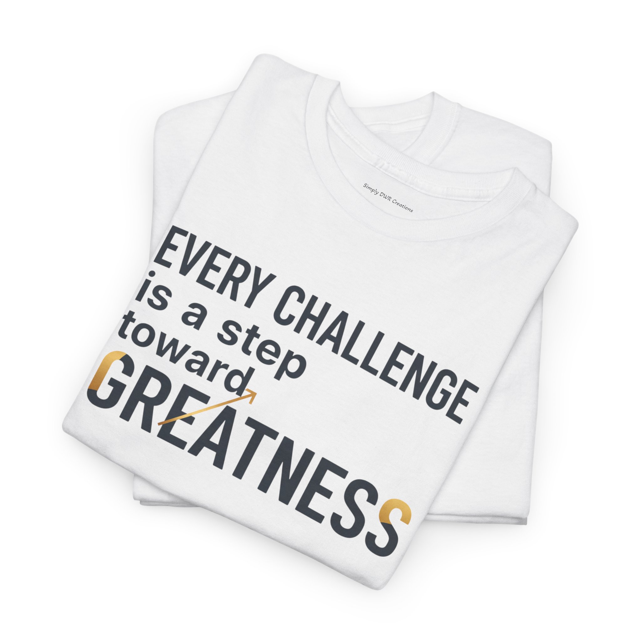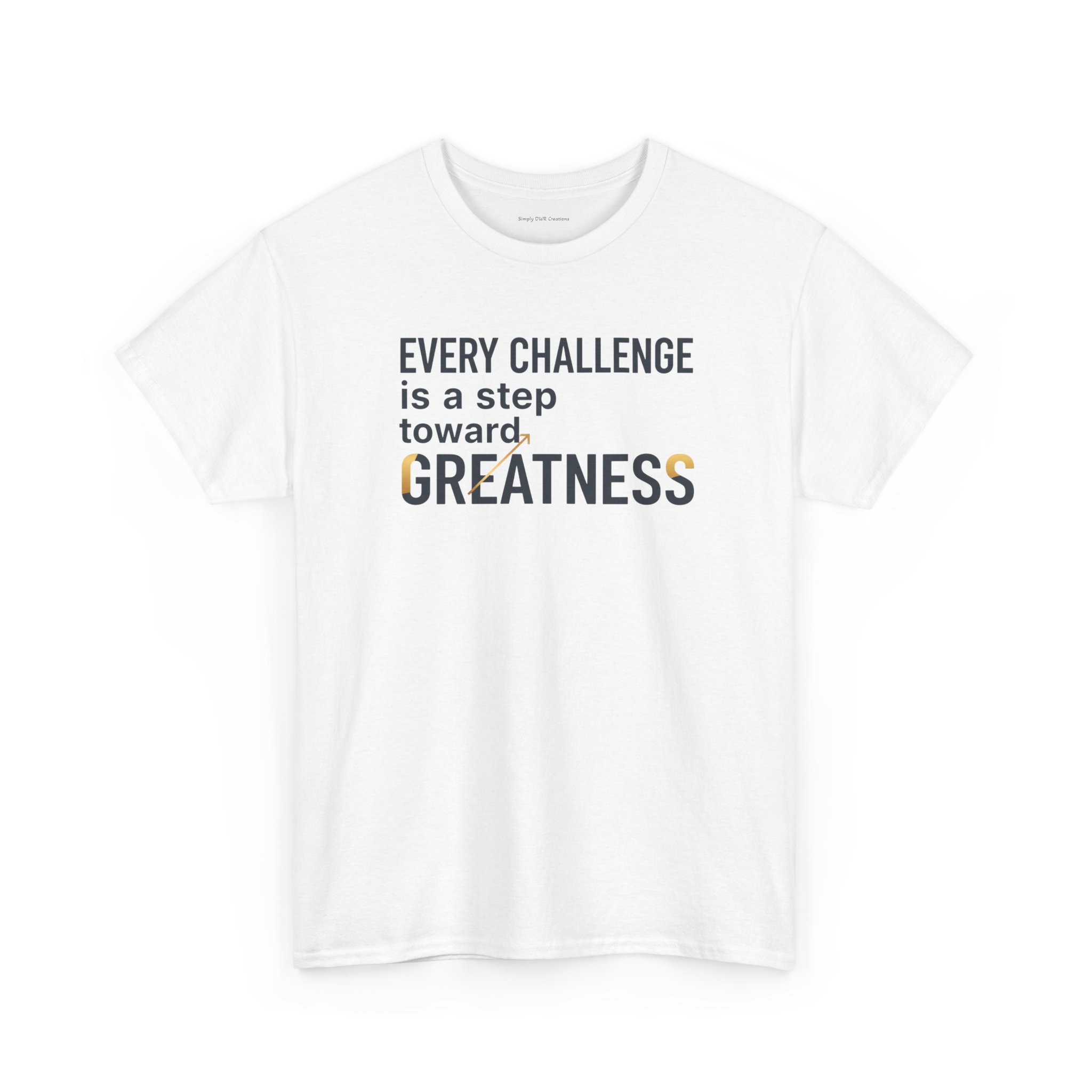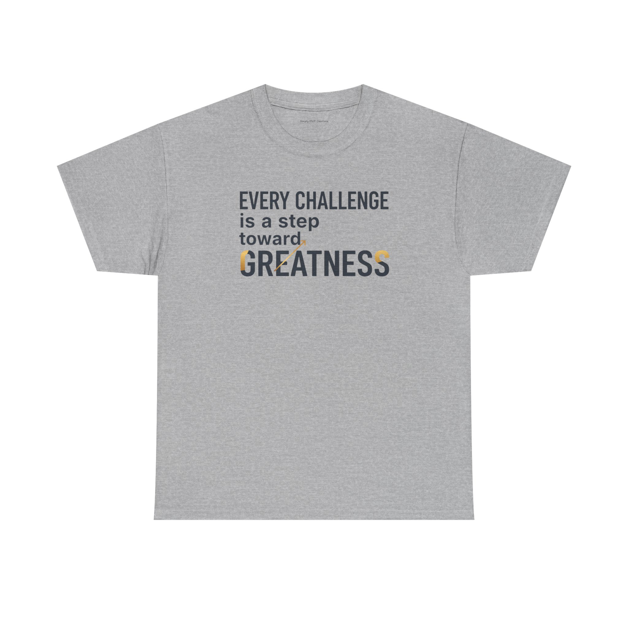 Light, clean, and quietly motivating — this cotton tee carries a small but steady message: every challenge moves you forward. The soft, midweight fabric sits comfortably against the skin while the classic crew neckline and relaxed fit let you layer it or wear it solo. The understated front print uses crisp typography with a touch of warm color to highlight the word “GREATNESS,” so the design reads like a personal reminder rather than loud branding. Wear it on training days, long commutes, or slow Sunday mornings when you need a gentle nudge to keep going.