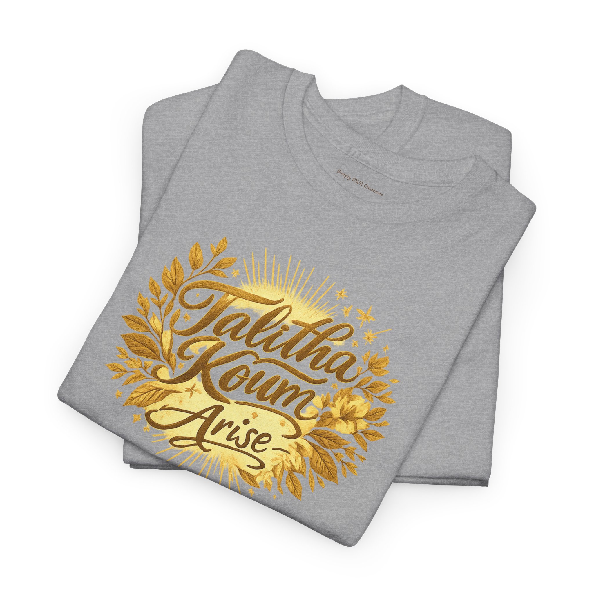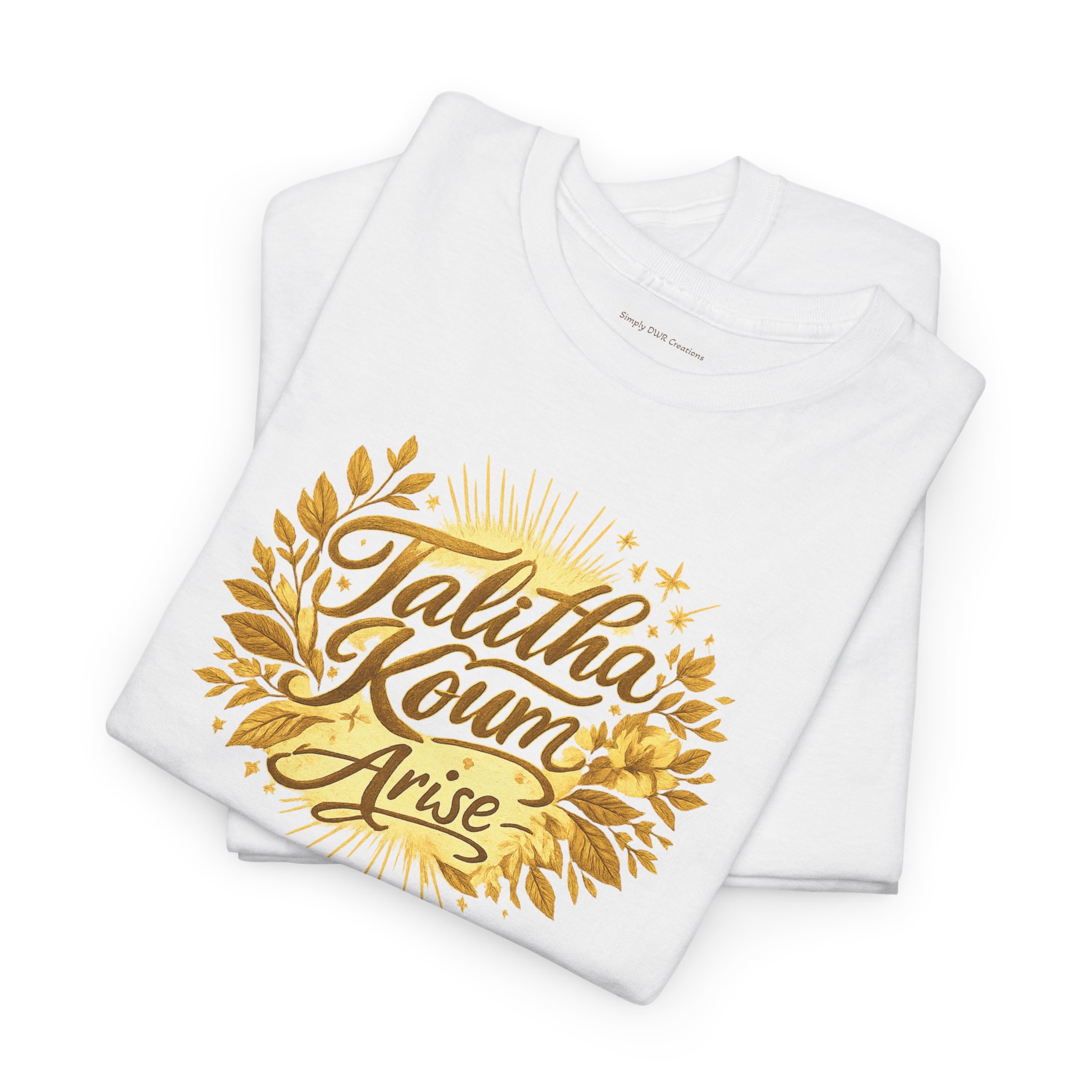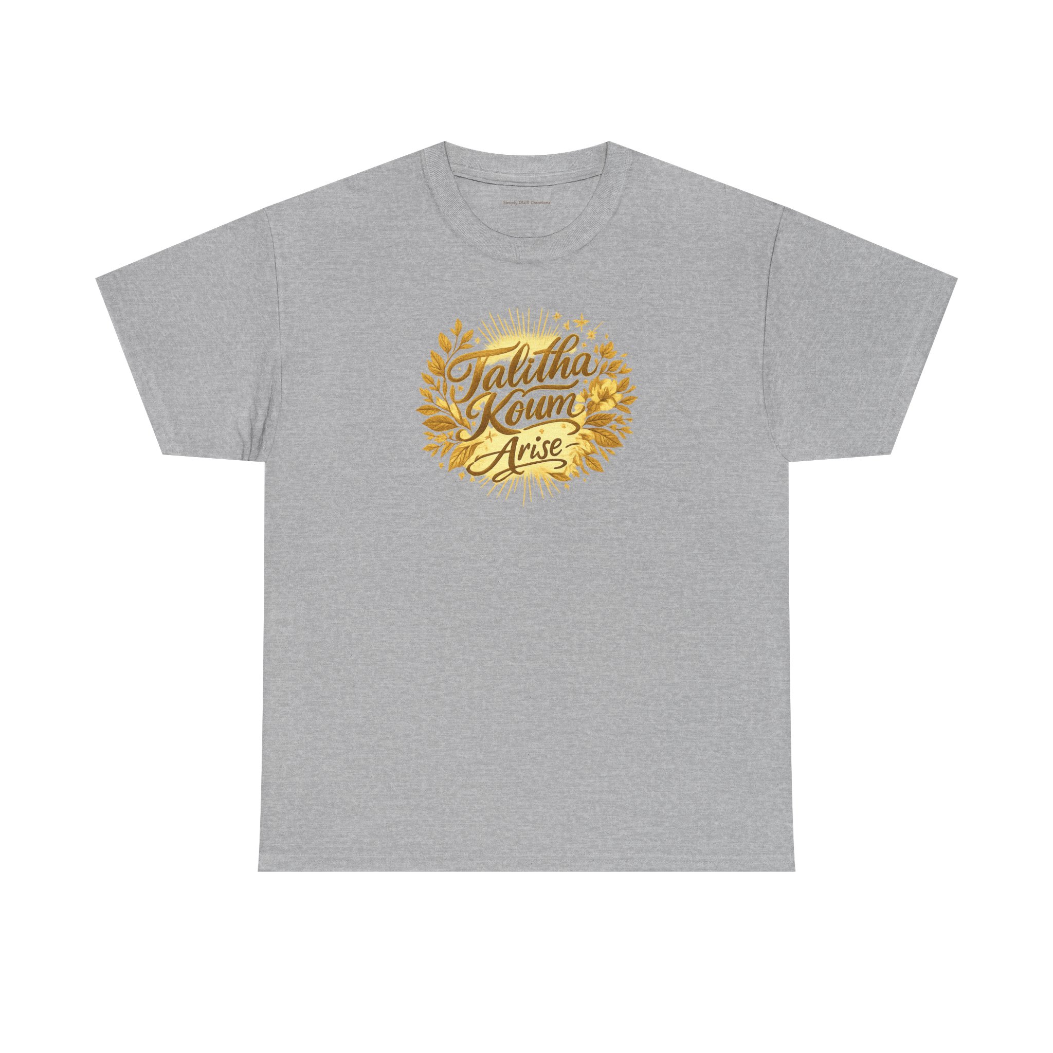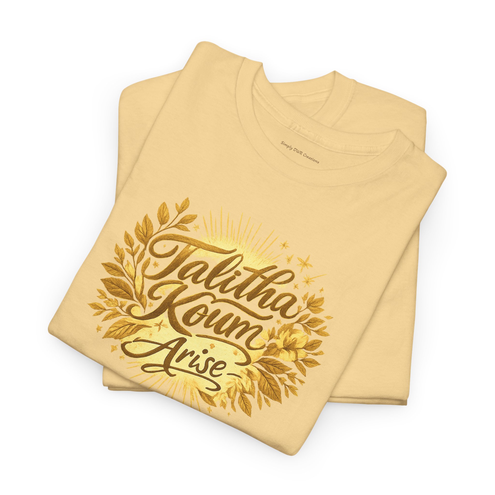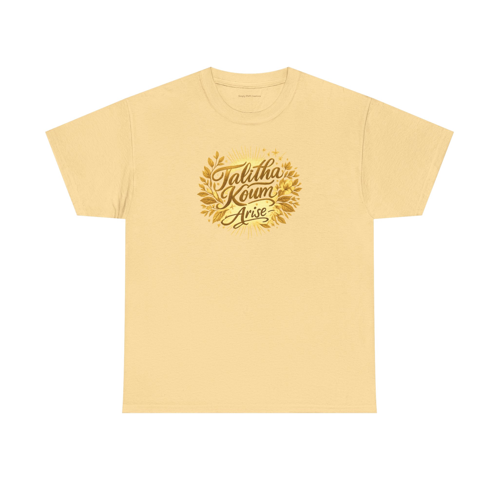 Soft, breathable, and built to last — this classic cotton tee carries a warm, hand-lettered design that reads “Talitha Koum Arise” framed by golden foliage. It feels like a quiet morning: sun slanting through leaves, a gentle reminder to stand, to hope, to move. The relaxed crew fit and medium-weight cotton sit comfortably for everyday wear, while the subtle vintage-gold palette keeps the message gentle and uplifting. Wear it to small group gatherings, reflective mornings, or casual weekends that need a little encouragement.